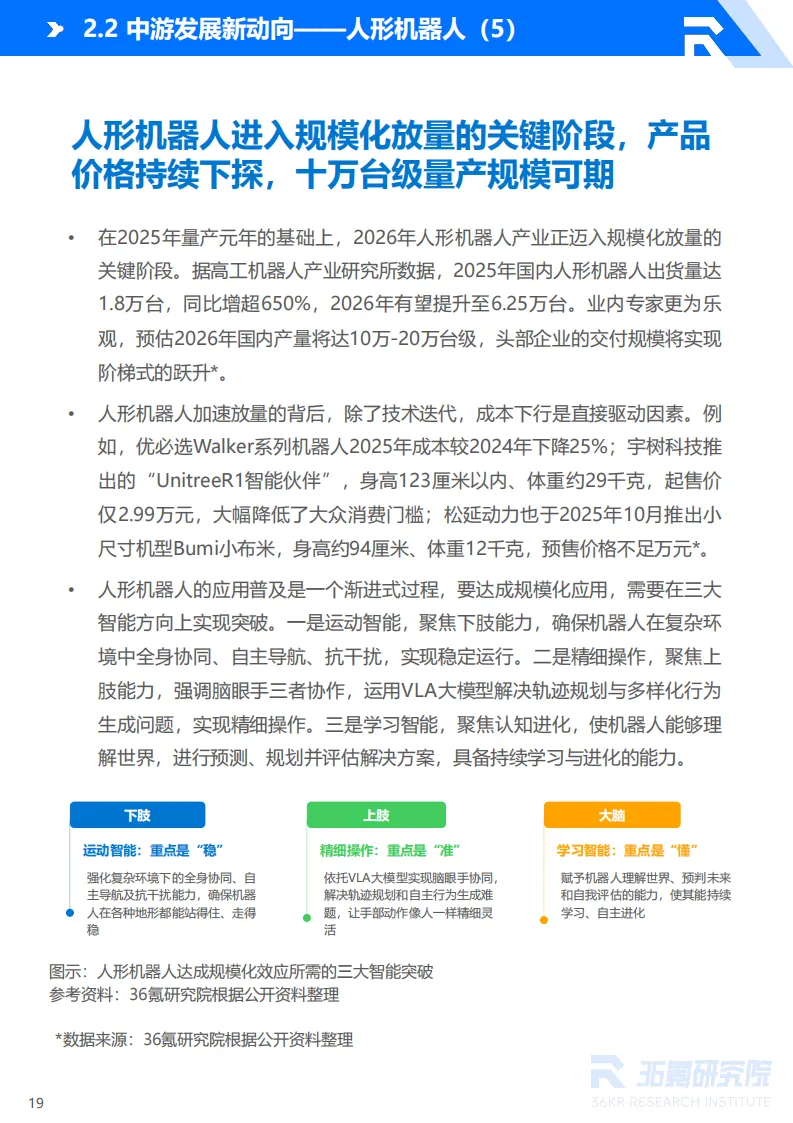 《报告》明确提出,人形机器人作为具身智能的主要落地载体,2026年将进入规模化放量的关键发展期,十万台级别的量产规模有望落地。但要实现这一目标,目前仍面临两大核心瓶颈:机器人大脑的技术突破与硬件成本的持续优化。