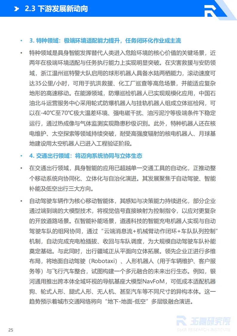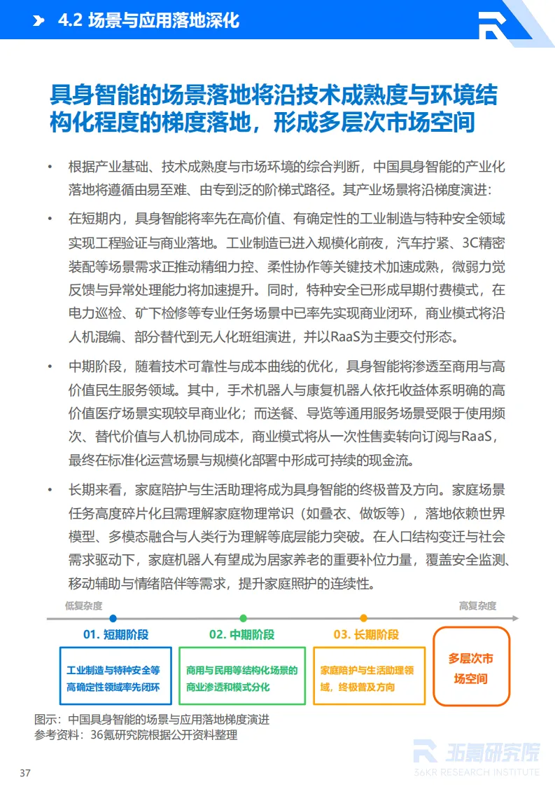 《报告》预测,未来具身智能将实现从技术闭环向生态协同的跨越,逐步转变为可规模化部署的通用型劳动力,场景落地将按照“工业制造/特种安全→商用服务→家庭陪护”的梯度有序推进。