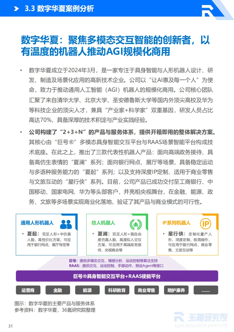 当前,国内具身智能企业已形成差异化竞争格局:银河通用聚焦全栈自研,以大模型驱动场景落地;数字华夏主打多模态交互,突破机器人情感交互难题;擎朗智能深耕服务场景,构建“岗位化”协同模式。这些企业的探索与实践,不仅推动了核心技术的商业化落地,也不断完善了产业生态,为中国具身智能的规模化发展奠定了坚实基础。