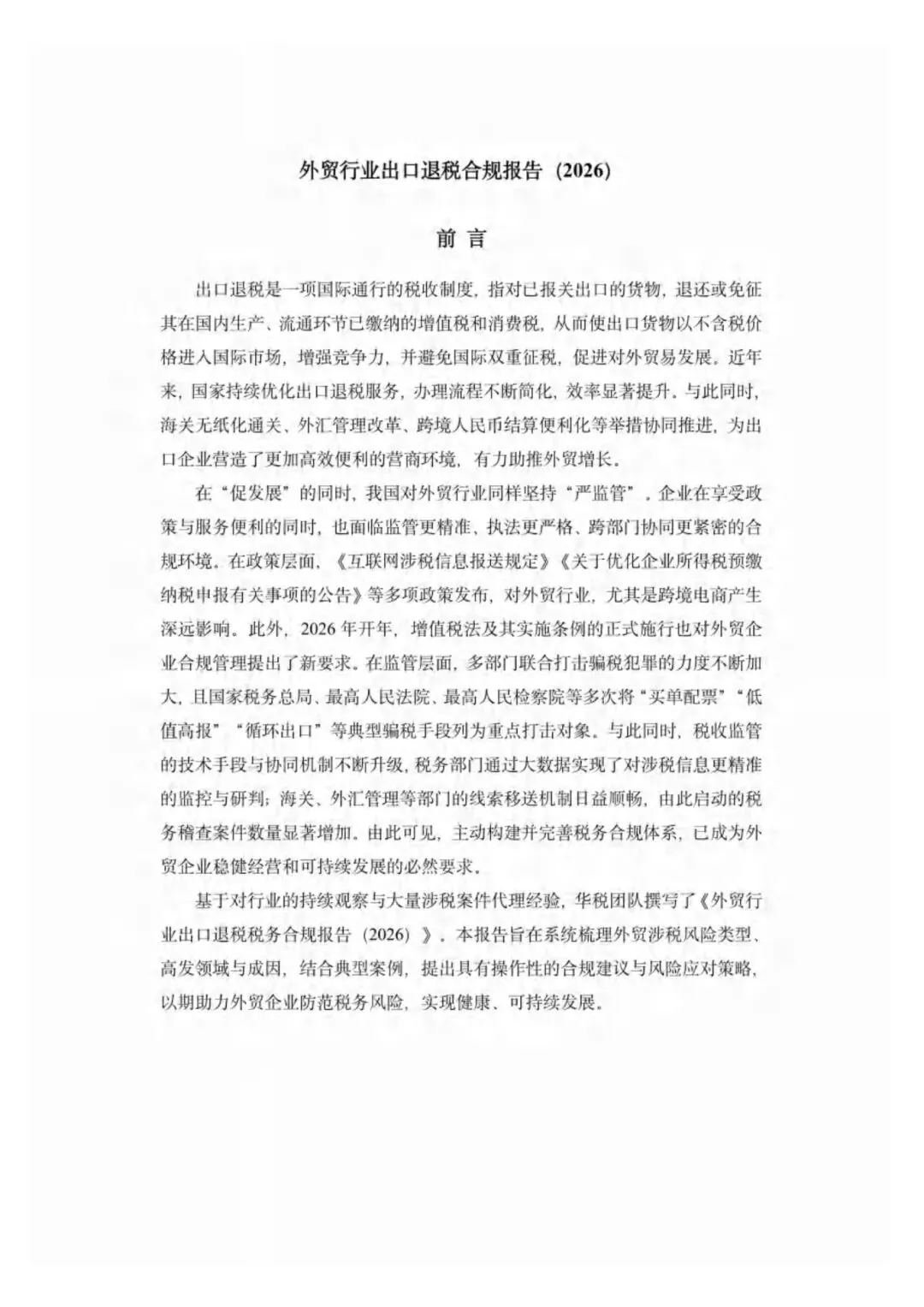 该报告由华税律师事务所发布,基于 2025 年外贸行业发展数据、税收监管政策及典型案例,系统梳理出口退税合规风险点、高发领域、行政救济要点及刑事辩护策略,分析《增值税法》实施等政策对行业的影响,为外贸企业构建税务合规体系、防范骗税风险提供专业法律与实务指导。