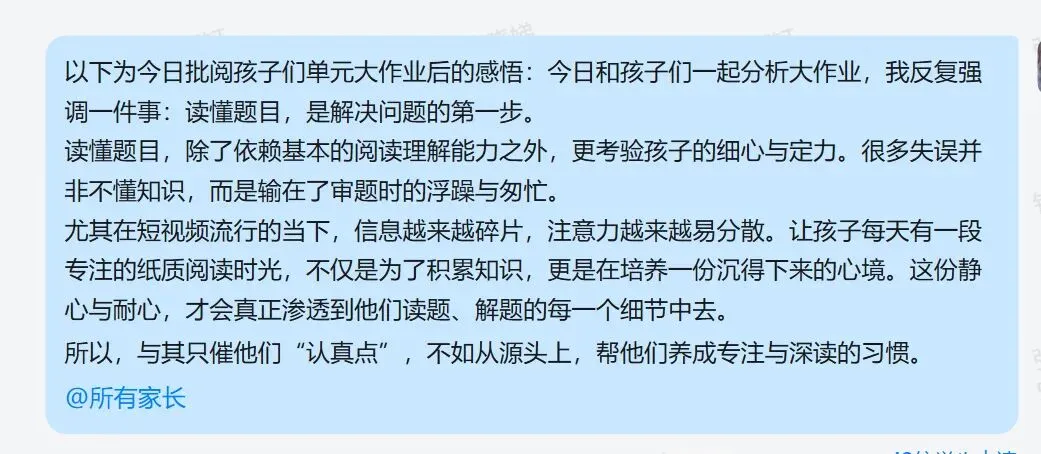 我越来越感觉到,这一代孩子的阅读理解能力正在普遍退化,而这不仅影响语文学习,也逐渐拖累其他学科。今天和数学老师交流,她也深有同感:题目里句子稍长一点,很多孩子就读不懂题意,结果交上来各种让人哭笑不得的答案。