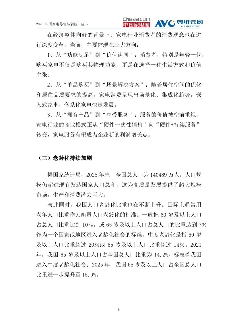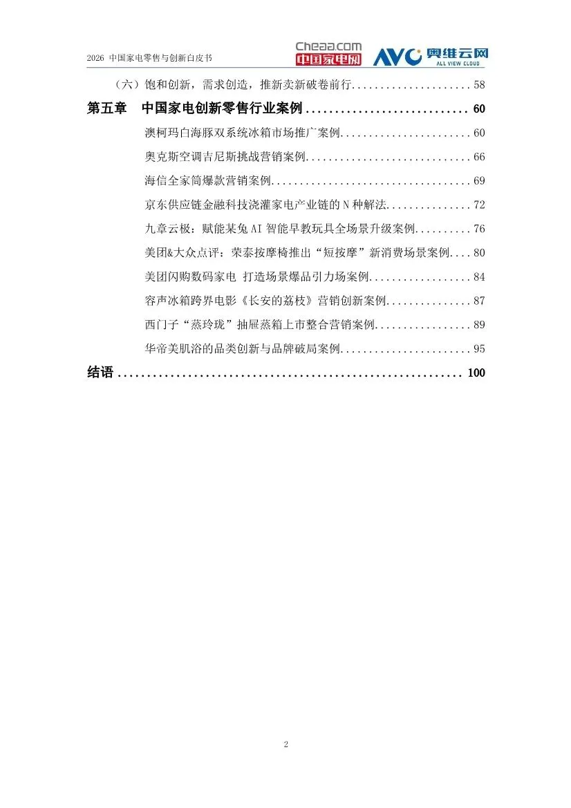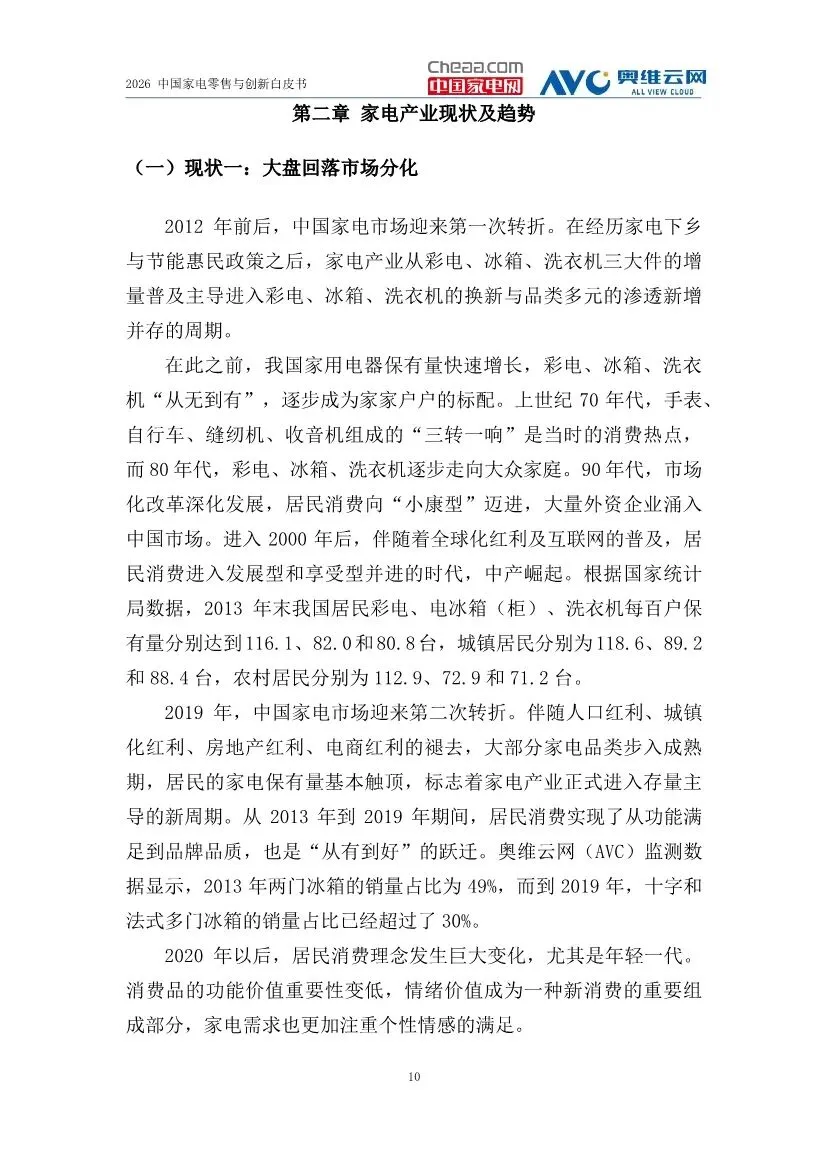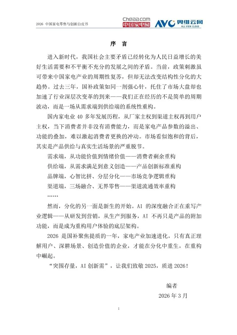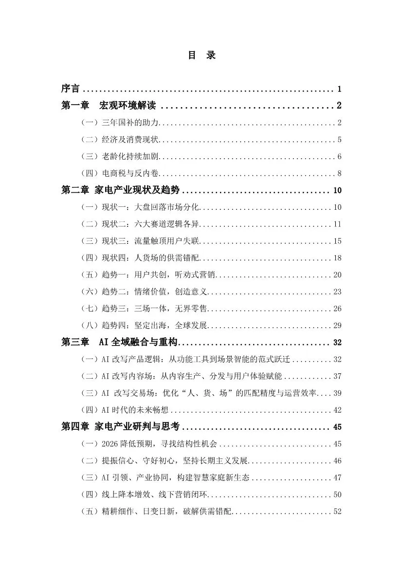 这份报告全面、系统地剖析了中国家电产业在2026年宏观环境、产业现状、技术变革下的挑战与机遇,不仅是一份详实的行业诊断书,更是一本指引企业“突围存量,AI创新”的实战指南。本报告的核心价值在于,它清晰地指出了一个根本性矛盾:政策刺激带来的周期性复苏,无法改变行业结构性分化的大趋势。报告旨在帮助企业理解,当前经历的是从需求端到供给端的“系统性重构”,并在此背景下,提供了从宏观研判到微观执行、从理论趋势到实战案例的完整行动框架。1. 宏观环境:政策精准化、消费理性化、结构老龄化• 国补政策“提质”导向明确:报告详细梳理了2024-2026年“家电以旧换新”国补政策的演进。核心变化是:补贴品类从“扩围”到“聚焦”(2026年聚焦6类核心家电+4类数码产品);能效门槛大幅提高(仅补贴1级能效产品);补贴上限下调。这清晰表明政策重心从刺激“量”的扩张,转向引导产业向绿色、高端、智能化“质”的升级。政策拉动效应减弱,对企业“无补贴”环境下的真实创新能力提出更高要求。• 消费市场“K型分化”加剧:在宏观经济与居民收入向好的大背景下,消费呈现明显的结构性特征。一方面,消费者从“功能满足”转向“价值认同”与“场景解决方案”,愿为情绪价值和服务付费;另一方面,市场呈现“K型结构”,高端消费与追求极致性价比的基础消费同步增长,而中间的大众市场收窄。• “银发经济”成为确定性增量市场:2025年65岁及以上人口占比达15.9%,老龄化持续加剧。这要求产品创新必须聚焦“适老性”,在人机交互(简化UI、语音操控)和安全防护(主动预警)上进行革新,家电的“适老”与“科技”属性需深度融合。• 现状一:大盘回落与市场分化:2025年市场规模同比下滑4.3%,预测2026年将继续下滑6.7%。市场在节奏、品类、品牌、渠道、价格五个维度全面分化,企业需放弃普适性增长幻想,寻找结构性机会。• 现状二:六大赛道逻辑各异:报告创造性地区分了彩电、空调、冰箱、洗护、厨卫、小家电及清洁六大赛道,并指出各自的核心竞争逻辑与增长动力截然不同。例如,彩电需“快速创新”重塑价值,空调靠“成本与吨位”洗牌,冰箱要“有序升级”等待换新周期,洗护看“分区洗”破局,厨卫拼“用户心智”,小家电靠“潮品创品”。这要求企业必须摒弃一刀切策略,进行赛道精细化运营。• 现状三:流量触顶与用户失联:线上流量成本高企、进入存量博弈;线下则面临“数据孤岛、浅层互动、同质化困局、服务断层”导致的“用户失联”。企业与用户的连接是脆弱、低效、缺乏温度的。• 现状四:人货场的供需错配:这是增长乏力的根本症结。表现为:人与内容的错配(信息过载但共鸣缺失)、需求与产品的错配(供给泛化但精准不足)、策略与区域的错配(统一政策与多元市场矛盾)。本质是线性供给体系无法匹配网状、圈层化的需求结构。• 趋势一:用户共创,听劝式营销:构建C2M2C(用户到制造到用户)闭环。其核心是权力关系转移,通过“企业家IP”建立信任,通过“听劝”姿态在社交媒体发起真诚对话,让用户深度参与产品研发与改进,并通过社群运营沉淀用户资产,将用户从消费者转化为设计者、传播者与共建者。• 趋势二:情绪价值,创造意义:在功能同质化背景下,竞争锚点转向情绪价值。通过场景化叙事(将参数转化为生活故事)、美学设计(作为价值沟通的第一印象)、服务体验(交易转化为有温度的互动)、品牌叙事(构建持久的意义内核)来满足用户的情感慰藉、意义建构与自我实现需求。• 趋势三:三场一体,无界零售:重构零售场域,实现“远场-近场-现场”协同。 ◦ 远场(货架电商):竞争关键是“货品升级”,从SEO转向GEO(生成式引擎优化),承接计划性需求。 ◦ 近场(即时零售):竞争关键是“人的捕捉”,通过“算法+物理围栏”满足即时性需求,是重要的增量场。 ◦ 现场(实体门店):竞争关键是“场的运营”,从销售场转型为“体验中心”和“生活方式提案空间”。• 趋势四:坚定出海,全球发展:全球化是从“规模领先”到“品牌领先”的必然选择。企业需从单纯贸易转向系统性海外经营,通过深度本土化运营(研发、生产、营销、服务)来提升品牌附加值、分散市场风险、构建全球竞争力。报告将AI定位为驱动产业系统性重塑的底层引擎,其影响是全域性的:• AI改写产品逻辑:实现从“功能工具”到“场景智能”的范式跃迁。产品价值从“性能参数”转向“服务体验”,通过“感知-决策-执行”闭环提供主动智能;应用场景从“单品智能”走向“场景融合”(如智慧厨房、卧室);商业模式从“一次性交付”变为“常态化迭代”,通过OTA和用户数据驱动产品持续进化。 ◦ 生产:AIGC工具实现“千人千面”内容批量生成,虚拟数字人提供稳定可控的直播资产。 ◦ 分发:基于合规数据进行精准需求匹配,实现“内容找人”。 ◦ 交互:AR实景融合解决家电“想象偏差”,AI智能设计工具辅助成套方案销售。 ◦ 销售前:智能导购从“搜索匹配”升级为“需求挖掘”,通过自然对话主动挖掘用户潜在需求。 ◦ 销售中:通过全域数据整合,实现用户生命周期节点的精准触达与智能履约。 ◦ 销售后:服务从成本中心转向价值创造中心,通过预测性维护、增值服务推荐延伸价值链。• 核心研判:2026年要“降低预期,寻找结构性机会”(如存