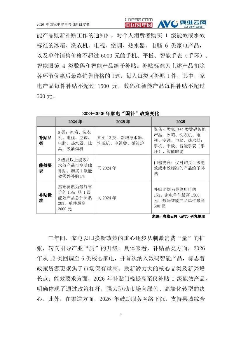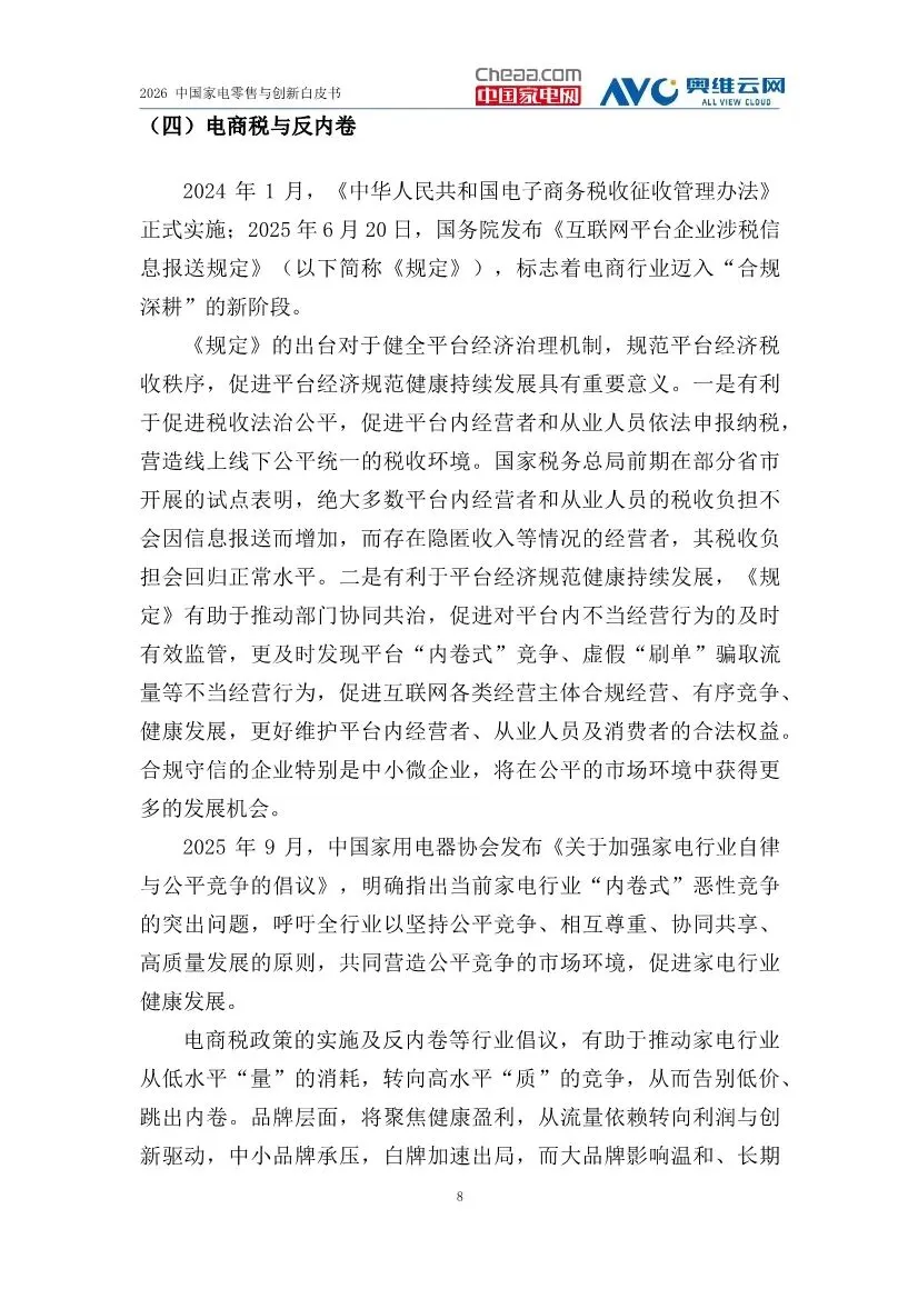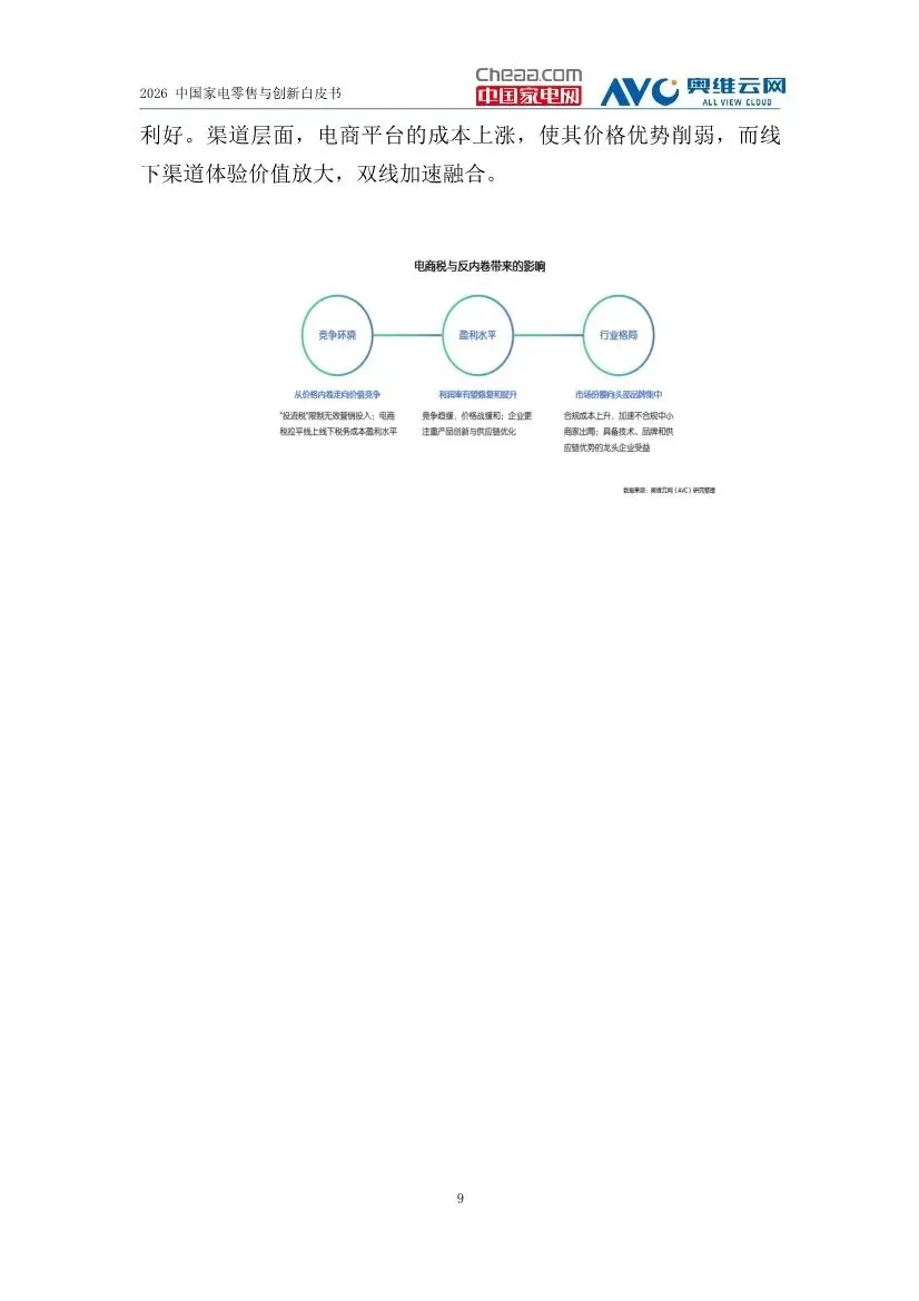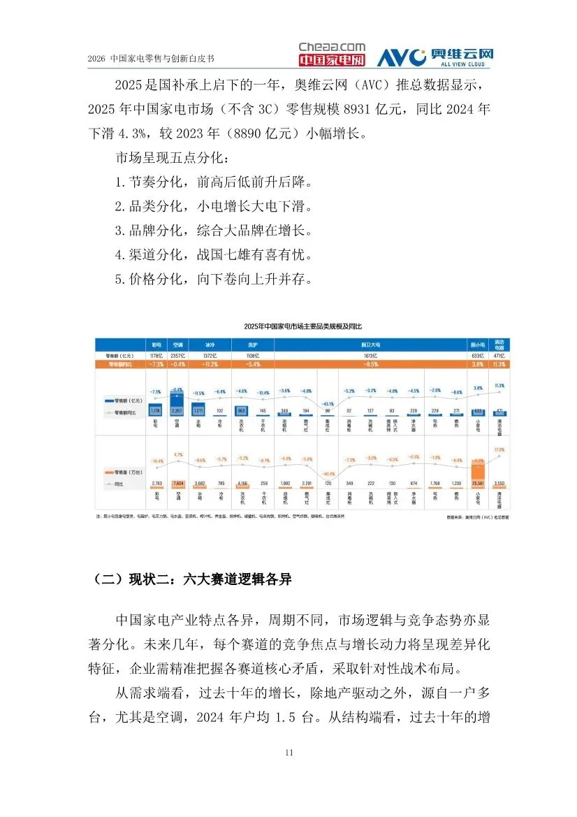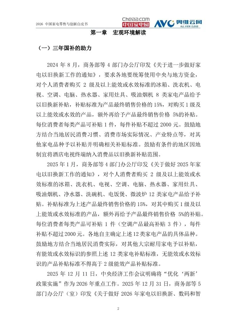 这份报告全面、系统地剖析了中国家电产业在2026年宏观环境、产业现状、技术变革下的挑战与机遇,不仅是一份详实的行业诊断书,更是一本指引企业“突围存量,AI创新”的实战指南。本报告的核心价值在于,它清晰地指出了一个根本性矛盾:政策刺激带来的周期性复苏,无法改变行业结构性分化的大趋势。报告旨在帮助企业理解,当前经历的是从需求端到供给端的“系统性重构”,并在此背景下,提供了从宏观研判到微观执行、从理论趋势到实战案例的完整行动框架。1. 宏观环境:政策精准化、消费理性化、结构老龄化• 国补政策“提质”导向明确:报告详细梳理了2024-2026年“家电以旧换新”国补政策的演进。核心变化是:补贴品类从“扩围”到“聚焦”(2026年聚焦6类核心家电+4类数码产品);能效门槛大幅提高(仅补贴1级能效产品);补贴上限下调。这清晰表明政策重心从刺激“量”的扩张,转向引导产业向绿色、高端、智能化“质”的升级。政策拉动效应减弱,对企业“无补贴”环境下的真实创新能力提出更高要求。• 消费市场“K型分化”加剧:在宏观经济与居民收入向好的大背景下,消费呈现明显的结构性特征。一方面,消费者从“功能满足”转向“价值认同”与“场景解决方案”,愿为情绪价值和服务付费;另一方面,市场呈现“K型结构”,高端消费与追求极致性价比的基础消费同步增长,而中间的大众市场收窄。• “银发经济”成为确定性增量市场:2025年65岁及以上人口占比达15.9%,老龄化持续加剧。这要求产品创新必须聚焦“适老性”,在人机交互(简化UI、语音操控)和安全防护(主动预警)上进行革新,家电的“适老”与“科技”属性需深度融合。• 现状一:大盘回落与市场分化:2025年市场规模同比下滑4.3%,预测2026年将继续下滑6.7%。市场在节奏、品类、品牌、渠道、价格五个维度全面分化,企业需放弃普适性增长幻想,寻找结构性机会。• 现状二:六大赛道逻辑各异:报告创造性地区分了彩电、空调、冰箱、洗护、厨卫、小家电及清洁六大赛道,并指出各自的核心竞争逻辑与增长动力截然不同。例如,彩电需“快速创新”重塑价值,空调靠“成本与吨位”洗牌,冰箱要“有序升级”等待换新周期,洗护看“分区洗”破局,厨卫拼“用户心智”,小家电靠“潮品创品”。这要求企业必须摒弃一刀切策略,进行赛道精细化运营。• 现状三:流量触顶与用户失联:线上流量成本高企、进入存量博弈;线下则面临“数据孤岛、浅层互动、同质化困局、服务断层”导致的“用户失联”。企业与用户的连接是脆弱、低效、缺乏温度的。• 现状四:人货场的供需错配:这是增长乏力的根本症结。表现为:人与内容的错配(信息过载但共鸣缺失)、需求与产品的错配(供给泛化但精准不足)、策略与区域的错配(统一政策与多元市场矛盾)。本质是线性供给体系无法匹配网状、圈层化的需求结构。• 趋势一:用户共创,听劝式营销:构建C2M2C(用户到制造到用户)闭环。其核心是权力关系转移,通过“企业家IP”建立信任,通过“听劝”姿态在社交媒体发起真诚对话,让用户深度参与产品研发与改进,并通过社群运营沉淀用户资产,将用户从消费者转化为设计者、传播者与共建者。• 趋势二:情绪价值,创造意义:在功能同质化背景下,竞争锚点转向情绪价值。通过场景化叙事(将参数转化为生活故事)、美学设计(作为价值沟通的第一印象)、服务体验(交易转化为有温度的互动)、品牌叙事(构建持久的意义内核)来满足用户的情感慰藉、意义建构与自我实现需求。• 趋势三:三场一体,无界零售:重构零售场域,实现“远场-近场-现场”协同。 ◦ 远场(货架电商):竞争关键是“货品升级”,从SEO转向GEO(生成式引擎优化),承接计划性需求。 ◦ 近场(即时零售):竞争关键是“人的捕捉”,通过“算法+物理围栏”满足即时性需求,是重要的增量场。 ◦ 现场(实体门店):竞争关键是“场的运营”,从销售场转型为“体验中心”和“生活方式提案空间”。• 趋势四:坚定出海,全球发展:全球化是从“规模领先”到“品牌领先”的必然选择。企业需从单纯贸易转向系统性海外经营,通过深度本土化运营(研发、生产、营销、服务)来提升品牌附加值、分散市场风险、构建全球竞争力。报告将AI定位为驱动产业系统性重塑的底层引擎,其影响是全域性的:• AI改写产品逻辑:实现从“功能工具”到“场景智能”的范式跃迁。产品价值从“性能参数”转向“服务体验”,通过“感知-决策-执行”闭环提供主动智能;应用场景从“单品智能”走向“场景融合”(如智慧厨房、卧室);商业模式从“一次性交付”变为“常态化迭代”,通过OTA和用户数据驱动产品持续进化。 ◦ 生产:AIGC工具实现“千人千面”内容批量生成,虚拟数字人提供稳定可控的直播资产。 ◦ 分发:基于合规数据进行精准需求匹配,实现“内容找人”。 ◦ 交互:AR实景融合解决家电“想象偏差”,AI智能设计工具辅助成套方案销售。 ◦ 销售前:智能导购从“搜索匹配”升级为“需求挖掘”,通过自然对话主动挖掘用户潜在需求。 ◦ 销售中:通过全域数据整合,实现用户生命周期节点的精准触达与智能履约。 ◦ 销售后:服务从成本中心转向价值创造中心,通过预测性维护、增值服务推荐延伸价值链。• 核心研判:2026年要“降低预期,寻找结构性机会”(如存