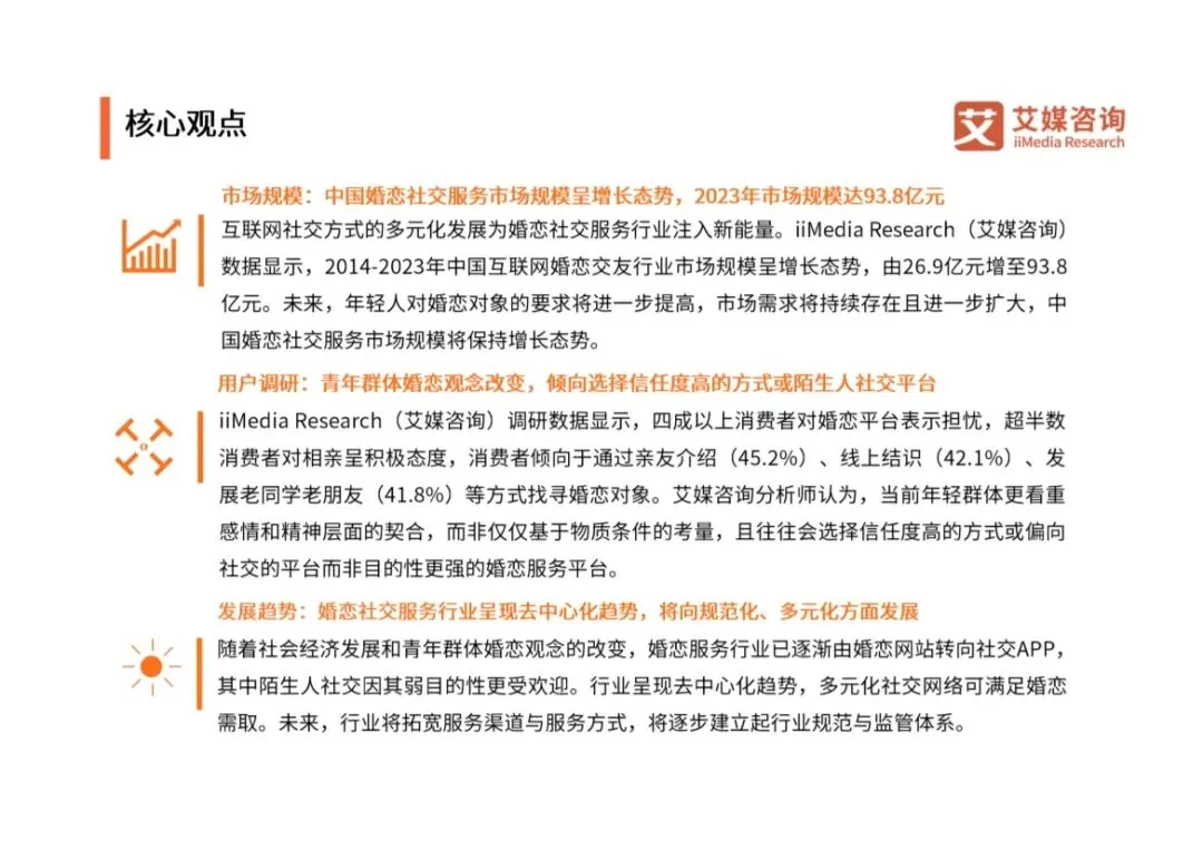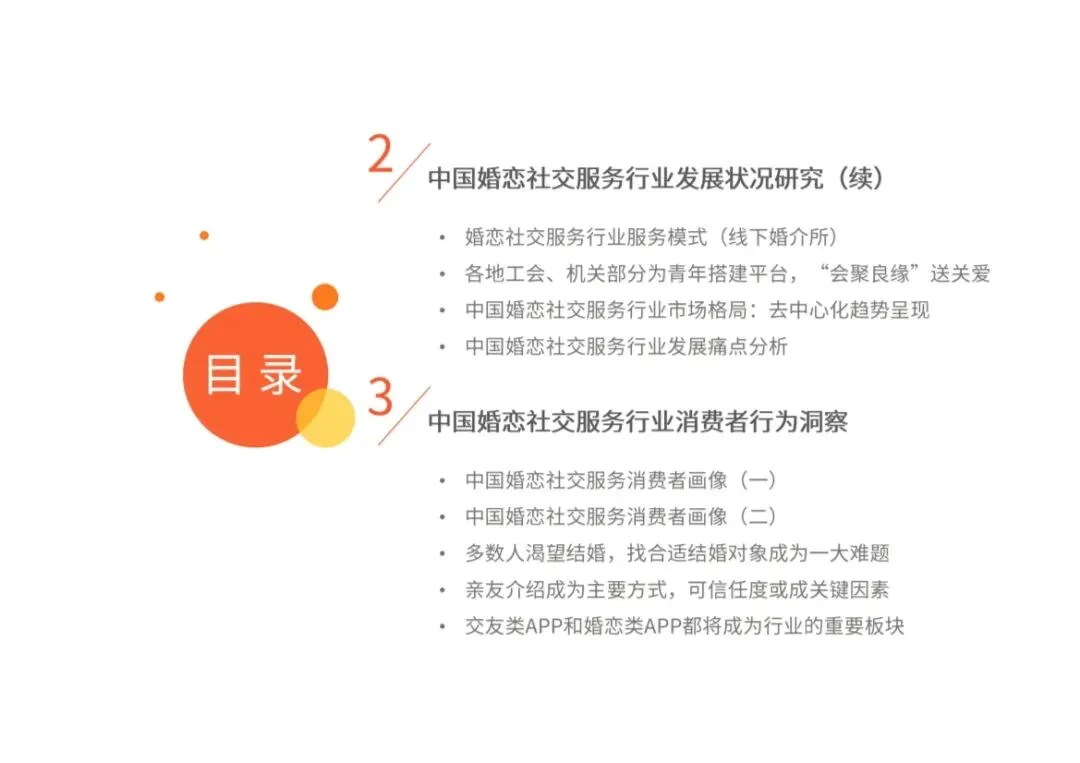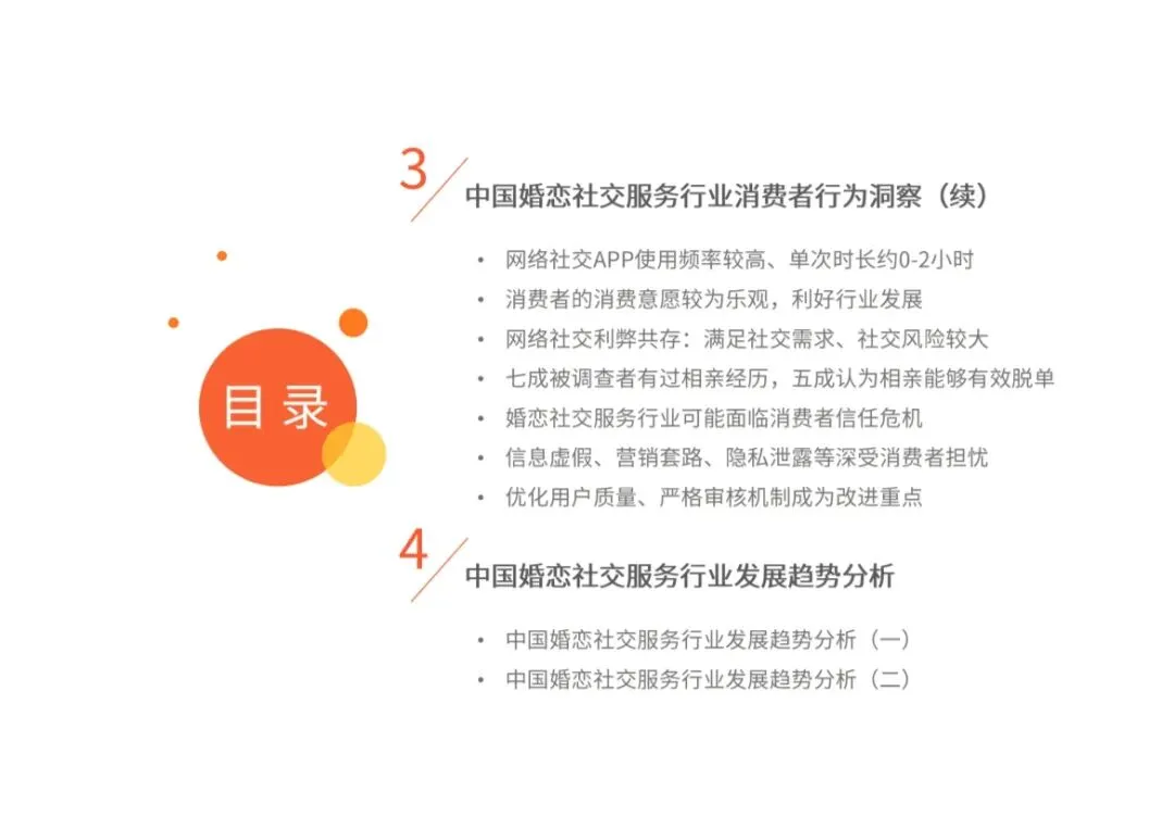 系统性地呈现了中国婚恋社交服务市场在2024-2025年的发展全貌,精准捕捉了在社会观念变迁与技术驱动下,行业从“中心化婚恋平台”向“去中心化社交网络”演进的关键转折点。本报告的核心价值在于,它清晰地揭示了一个核心矛盾:持续增长的市场需求与传统中心化婚恋平台信任危机、用户流失之间的矛盾。报告指出,解决这一矛盾、驱动行业增长的新动能,并非传统的婚恋网站,而是泛社交平台和线下可信渠道。它是一份帮助理解当下年轻人婚恋行为、市场格局演变及未来出路的“诊断书”与“导航图”。• 市场规模稳步扩大:2023年互联网婚恋交友市场规模达93.8亿元,且未来预计将持续增长。这证实了婚恋需求是长期存在的“刚需”。 ◦ 政策引导:国家层面关注青年婚恋与行业规范,从倡导文明风尚到专项整治乱象(如2023年底民政部会议),为行业健康发展划定边界。 ◦ 观念革新:这是最根本的驱动与挑战。超过70%的受访者认为“必须找到合适的对象才结婚”,年轻人更看重“精神契合”与“个性支持”,而非单纯物质条件。这直接导致结婚率下降、婚龄推迟,以及对婚恋服务的要求从“高效匹配”转向“深度理解与连接”。 ◦ 渠道迁移:互联网高普及率为婚恋社交提供了线上基础,但主阵地已从“婚恋网站”迁移至更广泛的“社交应用”。• “去中心化”趋势明朗:传统婚恋网站(如世纪佳缘、珍爱网)的市场主导地位被削弱。数据显示,陌生人社交APP(如陌陌、Soul)的月活跃用户数可达典型婚恋APP的10倍。婚恋需求被大量分流至各类社交网络、游戏、内容社区等“非目的性”场景。 1. 传统婚恋网站/APP:优势是目的明确、匹配算法,但面临用户信任危机和活跃度低的挑战。 2. 社交应用中的婚恋功能:以陌陌、Soul、探探为代表,通过“弱目的性”的泛社交切入,更受年轻用户青睐,成为当前最主流的线上方式。 3. 线下可信渠道复苏:包括亲友介绍(最受信任的方式)、线下婚介所(线上线下结合) 以及各地工会/政府举办的公益联谊活动(如“会聚良缘”)。线下渠道凭借其更高的可信度,成为线上信任缺失的重要补充。• 用户是谁:主力为25-35岁、学历较高、生活于一至三线城市的女性(占比64.9%)。她们面临工作生活压力,对婚姻质量要求高。• 如何寻找:首选亲友介绍(45.2%),其次是线上随意结识(42.1%) 和发展老同学关系(41.8%)。只有约40%的人会使用婚恋平台,使用陌生人社交APP和线下婚介所的更少。“信任度”是选择渠道的关键。• 为何担忧:超过四成用户对信息虚假、营销套路、隐私泄露深感担忧。2024年“3.15”晚会曝光后,近半数用户降低了相关平台使用频率。行业乱象严重侵蚀消费者信任。• 愿意为何付费:超过半数用户有付费意愿,但月消费集中在50-300元区间。他们最渴望平台提供真实的用户评价和严格的信息审核机制;最需要平台改进的则是管控用户质量、防范诈骗和确保信息真实可靠。1. 过度宣传与承诺:夸大效果,虚构造假人选,诱导高消费。2. 服务产品不规范:价格、服务标准不透明,因人定价。3. 从业人员不专业:缺乏正规培训与资质认证,专业性与公信力低。4. 信息不透明与欺骗:虚构用户条件,隐瞒关键信息。这些痛点共同导致了行业性的消费者信任危机,成为制约传统模式发展的最大瓶颈。• 规范化:在政策监管(民政部牵头)和消费者诉求的双重驱动下,行业将逐步建立规范与监管体系,整顿乱象,重建市场秩序。这是行业可持续发展的前提。• 多元化:服务渠道和方式将不断拓宽。线上,婚恋与社交的边界愈发模糊;线下,公益性与商业性服务并存。“婚恋社交”将融入更广泛的“社交生活”场景。• 价值回归:企业竞争将从流量和营销套路,回归到提升用户信任这一核心价值。通过严格审核保障信息真实、优化用户体验、提供专业服务来赢得市场,将是未来的核心竞争力。1. 市场存在,但蛋糕被重新分割:婚恋社交需求基本盘稳固且增长,但满足需求的主体已从“专业婚恋平台”变为“多元社交网络”。传统平台若不转型,市场份额将持续被侵蚀。2. “信任”是当前最稀缺的货币:无论是线下介绍的回归,还是用户对平台审核机制的强烈呼声,都指向同一核心——在信息过载和欺诈风险中,可信度已成为用户决策的首要因素。重建信任是行业复兴的关键。3. “弱目的性”社交成为主流入口:当代年轻人抗拒强目的性的、像简历交换般的婚恋方式。他们更倾向于在轻松、自然的泛社交中逐步发展关系。因此,具有社交属性和社区文化的平台更具吸引力。4. 线上线下的融合与互补:纯线上模式遭遇信任天花板,而线下渠道在可信度和深度沟通上具有天然优势。未来,线上高效发现与连接 + 线下可信验证与深度服务的OMO(Online-Merge-Offline)模式,可能成为更优解。总结,这份报告揭示了中国婚恋社交服务市场正处在一个关键的转型十字路口。它不再是一个由少数几家专业平台主导的封闭市场,而是一个融入更广阔数字社交生态的开放赛场。未来的赢家,将是那些能够深刻理解年轻一代婚恋观念、以技术手段筑牢信任基石、并在多元化场景中自然融入婚恋价值的服务提供方。部分内容预览