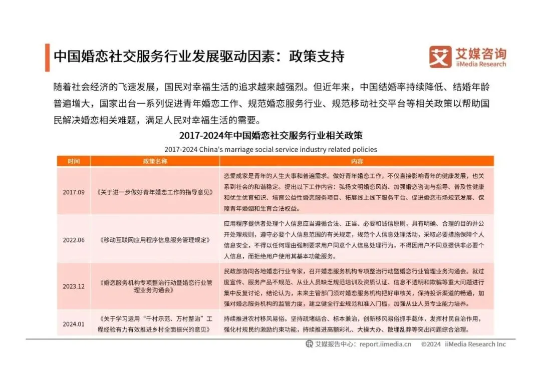 政策支持:国家层面高度重视青年婚恋问题,出台多项政策推动婚恋服务规范化,如《关于进一步做好青年婚恋工作的指导意见》等,强调婚恋服务的社会意义和行业规范。