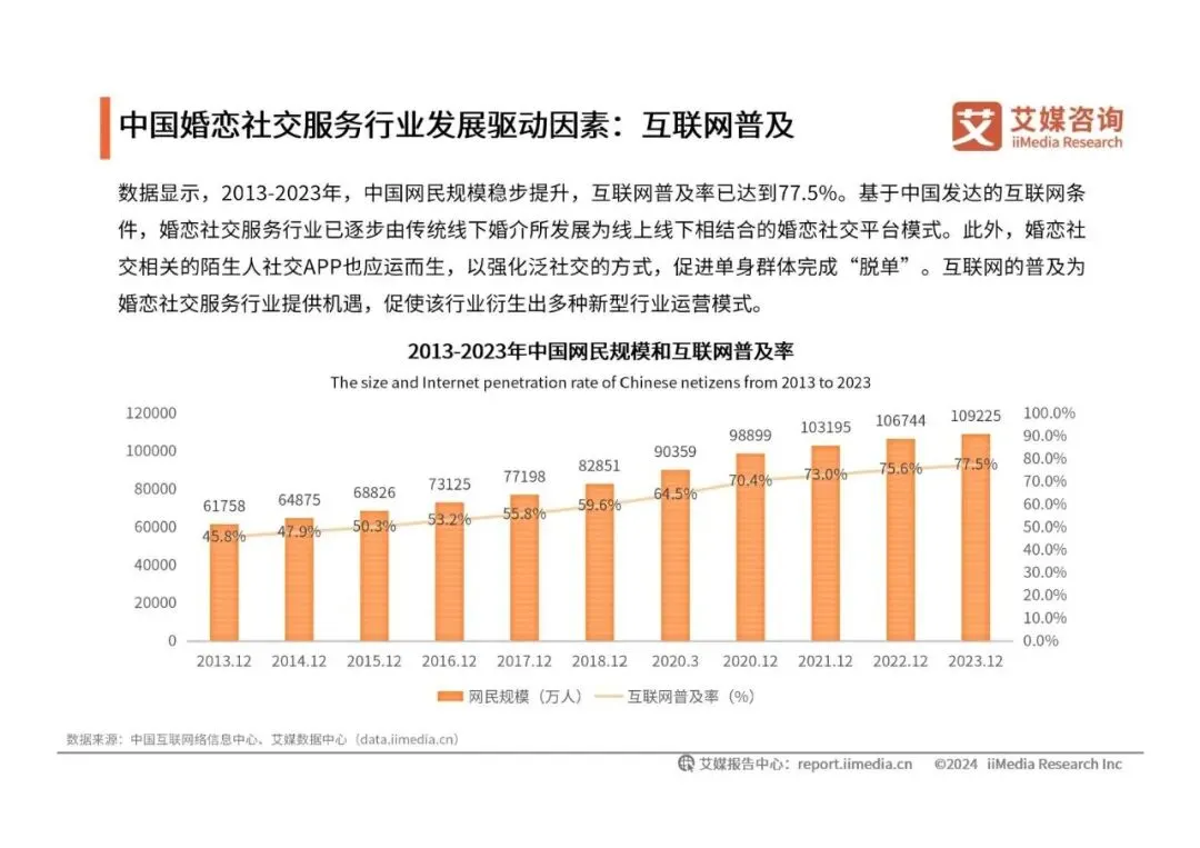 互联网普及:截至2023年,中国互联网普及率达77.5%,为婚恋社交服务的线上发展提供了坚实基础,推动了婚恋平台与社交APP的融合。