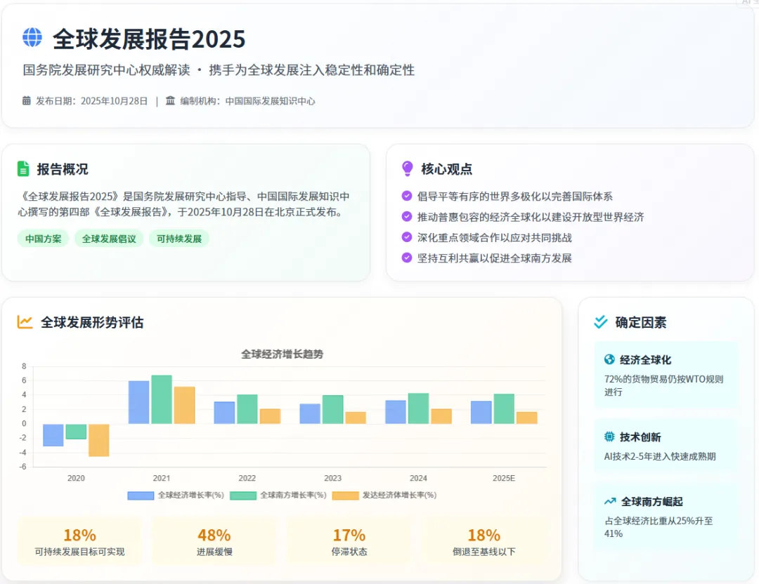 《全球发展报告 2025》作为中国权威智库发布的重要研究成果,对国内外政策制定具有重要的参考价值和指导意义。