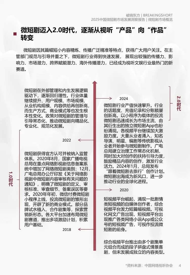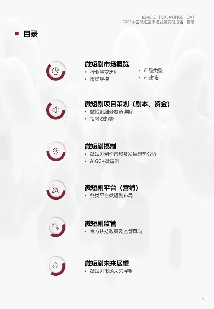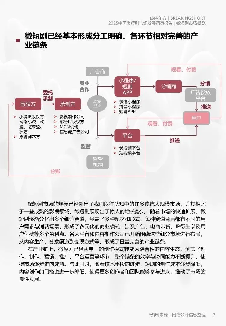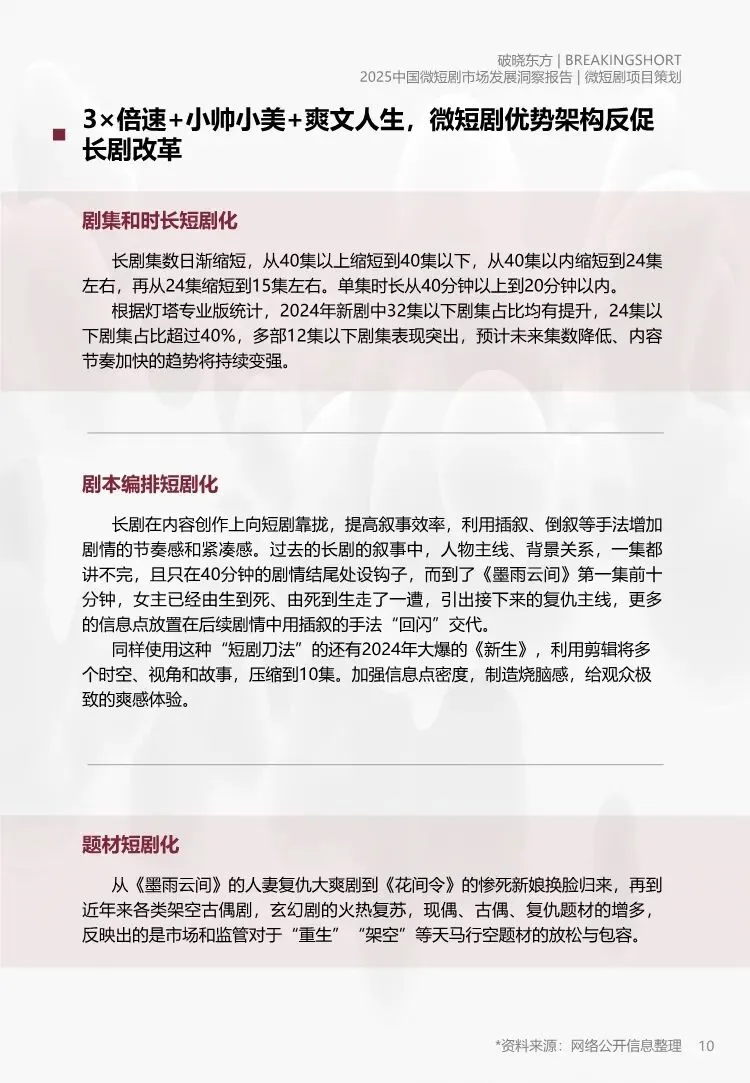 这份由“破晓东方”发布的《2025年中国微短剧市场发展洞察报告》系统性地描绘了中国微短剧市场在2025年的全景图,精准捕捉了行业从“野蛮生长”进入“精品化、规范化、产业化”关键转折期的核心特征。它不仅是一份详实的行业数据报告,更是一本深刻揭示“长短剧双向融合”这一根本性趋势,并指引从业者如何在新生态中定位与竞争的“战略指南”。本报告的核心价值在于,它清晰地论证了一个核心命题:微短剧已从一种“补充性”的视频产品,进化为一个规模庞大、生态复杂、并与主流影视工业深度互动的“主流内容形态”。报告通过详实的数据、清晰的分类和丰富的案例,阐明了微短剧如何“反哺”长剧、重塑产业链,并在政策引导下成为赋能千行百业的“文化容器”。• 市场规模跨越式发展:2024年市场规模达504.4亿元,首次超过内地电影总票房(425亿元)。预计2027年将超1000亿元。这一数据标志着微短剧已从边缘走向舞台中央,成为文娱消费的支柱力量之一。• 用户画像清晰:用户主体为二线以下城市、初中学历、月收入3000元以下的群体,但一线及新一线城市用户分布亦均匀。兴趣集中于时尚、美食、旅行等日常生活领域,这解释了“接地气”、“强情绪”内容盛行的原因。• 发展历程结构化:报告将行业发展梳理为四个阶段(2018-2024),清晰地展示了其从“段子拼盘”到“网文广告”,再到“付费小程序剧爆发”,最终在政策引导下走向“精品化与全球化”的演进路径。报告极具洞察力地将微短剧分为四类,并进行了详尽对比,这是理解行业复杂性的关键:• 长视频平台“会员微短剧”:横屏,10-20分钟/集。核心是与“腰部长剧”竞争平台资源,凭借更高的内容效率(拍摄20-30天,成本200-500万/部)和良好的口碑(如《虚颜》《念念无明》豆瓣超7分),成功“反哺”电视台(如登陆湖南、东方卫视黄金档),实现了价值的跃升。• 短视频平台“端原生微短剧”:横/竖屏,2-5分钟/集。核心逻辑是“养账号”,通过IAA(广告)模式或品牌定制(如周星驰“九五二七剧场”、柠萌影业“好有本领”)实现流量变现与品牌营销,是精品化厂牌的主战场。• “小程序微短剧”:竖屏,1-3分钟/集,80-100集/部。以“爽文”改编为主,依赖付费投流(IAP模式),精准触达下沉市场。报告指出,随着监管加强和免费剧(IAA)冲击,其粗放增长模式面临挑战。• “独立APP微短剧”:以“红果短剧”为代表,通过“免费观看+广告”(IAA)或混合模式(IAAP)快速崛起,其日活用户增长超10倍,正在重塑分发格局。• “长剧短剧化”:传统长剧在主动吸收微短剧的叙事精髓。表现为:集数缩短(2024年24集以下占比超40%)、节奏加快(如《墨雨云间》前十分钟完成“重生”复仇设定)、题材靠近(复仇、重生等“强情节”题材增多)。这本质是长剧对用户碎片化、高效化观看习惯的妥协与创新。• “短剧精品化与工业化”:微短剧自身在向专业化、体系化升级。报告以“听花岛”为例,展示了头部制作公司如何建立标准化的流程体系、内容生产方法论和全链条人才储备,推动影视工业化在短剧领域率先落地。• “短剧人才向上流动”:曾庆杰(《九重紫》)、知竹(《古相思曲》)等优秀短剧导演获得执导长剧的机会,并将其在短剧中磨练的“氛围感塑造”、“快节奏叙事”、“低成本创意”等能力带入长剧,为行业注入新血。• “微短剧+”跨界赋能:报告浓墨重彩地介绍了广电总局“微短剧+”行动计划,包括“跟着微短剧去旅行、来学法、来科普、看品牌、看非遗”等。这表明微短剧已被提升为赋能文旅、普法、科普、商业品牌、文化传承的国家级工具,其社会与经济价值得到双重认可。• 全流程提效:报告通过对比表格,详细展示了AIGC如何在前策、美术、选角、素材生产、后期等环节大幅压缩时间和成本,使“导演+AI工具”的小团队模式成为可能,催化创作民主化。• 现实瓶颈与挑战:报告也理性指出了AIGC应用的局限:情感表达僵硬(“动态PPT”)、物理逻辑错误、商业模式不明、版权归属模糊以及可能导致的影视“灵晕”消逝和从业者替代焦虑。这为行业拥抱技术提供了冷静的视角。• 长视频平台加码:爱腾优芒均将短剧提升至一级入口,并通过大幅提升分账单价(如优酷S级短剧单价从6元提至16元)、延长分账期、提供拉新激励等策略争夺优质内容。• 短视频平台深耕:抖音(推出红果短剧、出海APP Melolo)和快手(推出付费会员、建立商业短剧评估模型)在稳固流量优势的同时,向精品化、商业化深度探索。• 跨界玩家涌入:百度、华为、小米等科技公司,以及淘宝、京东、拼多多、美团等电商及本地生活平台全部入局,希望通过“短剧+带货/引流”挖掘新增量,使得微短剧平台格局呈现“全域混战”状态。报告系统梳理了2023年11月以来的监管脉络,显示政策思路清晰:通过专项整治打击低俗、盗版、收费乱象,同时通过“微短剧+”等计划大力扶持精品与正能量内容。这种“一手抓治理,一手抓繁荣”的策略,旨在推动行业走出灰色地带,实现健康可持续发展。1. 微短剧已成为主流,其竞争是“系统性能力”的竞争:行业已超越“赌爆款”的草莽阶段,进入比拼工业化制作体系、精细化用户运营、多元化商业模式以及合规化运作能力的综合实力阶段。2. “融合”是内容演进的绝对主线:不仅是长短剧形式的融合,