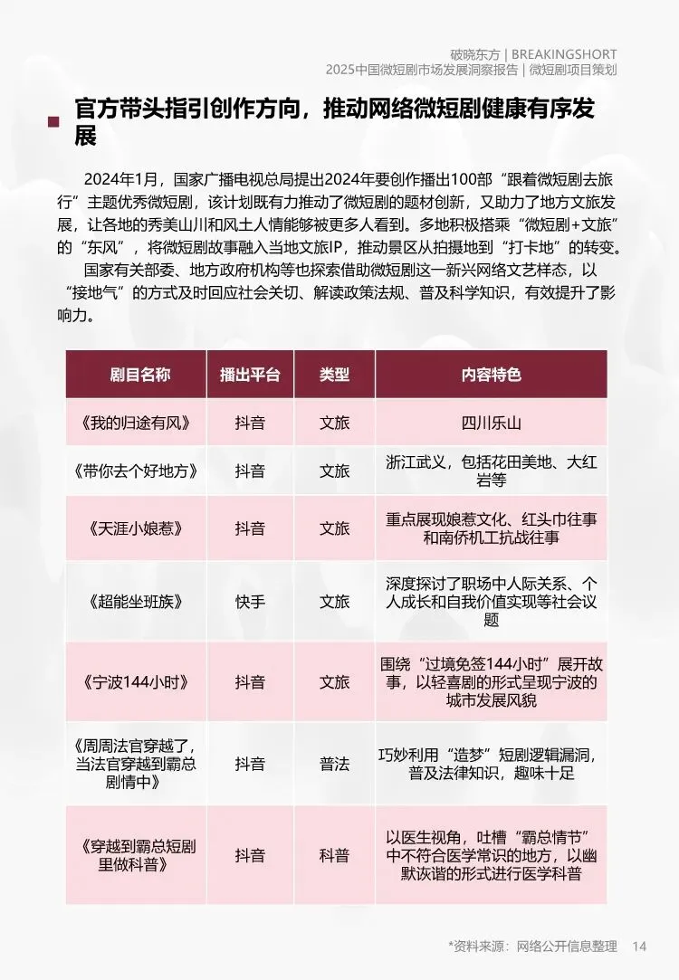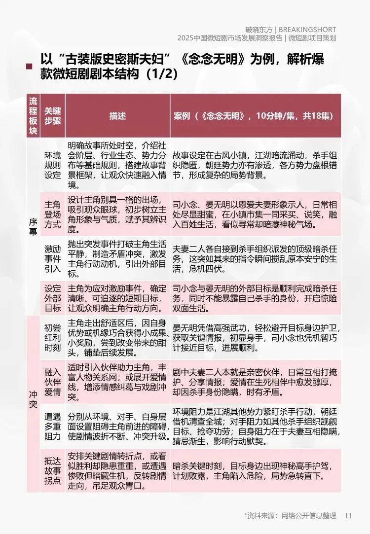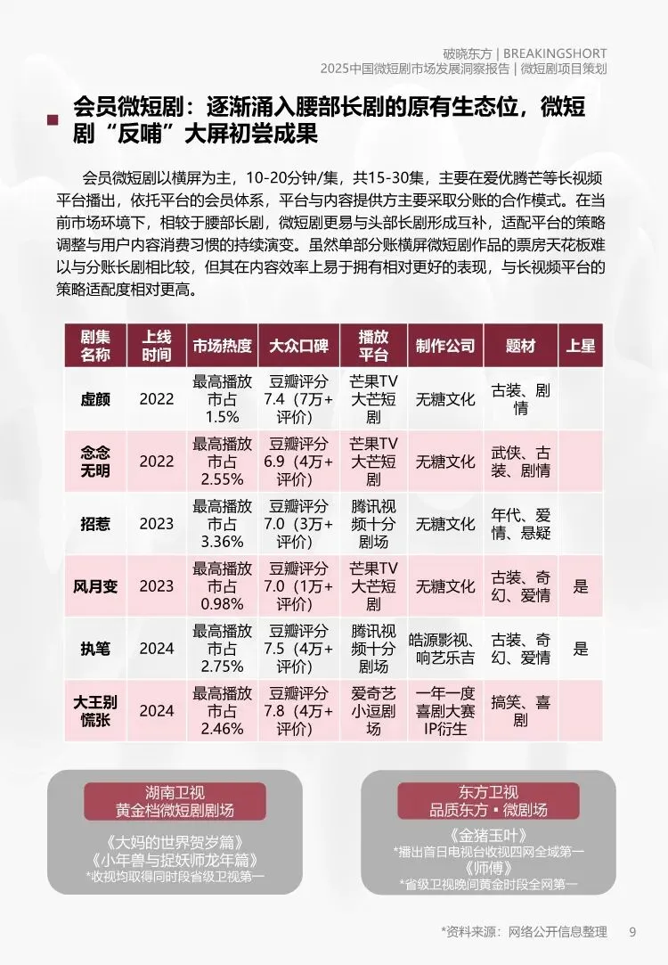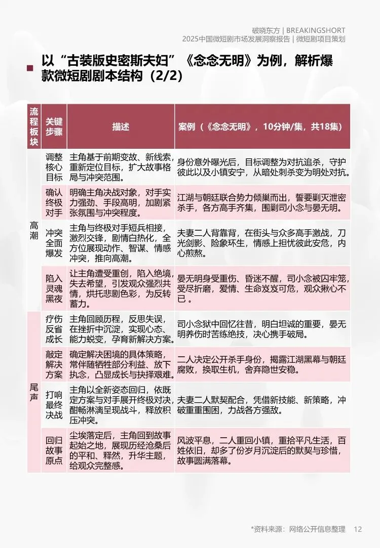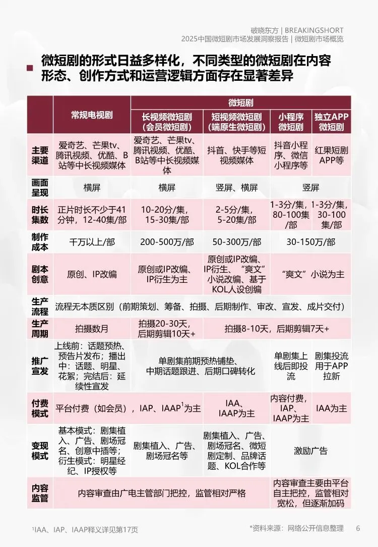 这份由“破晓东方”发布的《2025年中国微短剧市场发展洞察报告》系统性地描绘了中国微短剧市场在2025年的全景图,精准捕捉了行业从“野蛮生长”进入“精品化、规范化、产业化”关键转折期的核心特征。它不仅是一份详实的行业数据报告,更是一本深刻揭示“长短剧双向融合”这一根本性趋势,并指引从业者如何在新生态中定位与竞争的“战略指南”。本报告的核心价值在于,它清晰地论证了一个核心命题:微短剧已从一种“补充性”的视频产品,进化为一个规模庞大、生态复杂、并与主流影视工业深度互动的“主流内容形态”。报告通过详实的数据、清晰的分类和丰富的案例,阐明了微短剧如何“反哺”长剧、重塑产业链,并在政策引导下成为赋能千行百业的“文化容器”。• 市场规模跨越式发展:2024年市场规模达504.4亿元,首次超过内地电影总票房(425亿元)。预计2027年将超1000亿元。这一数据标志着微短剧已从边缘走向舞台中央,成为文娱消费的支柱力量之一。• 用户画像清晰:用户主体为二线以下城市、初中学历、月收入3000元以下的群体,但一线及新一线城市用户分布亦均匀。兴趣集中于时尚、美食、旅行等日常生活领域,这解释了“接地气”、“强情绪”内容盛行的原因。• 发展历程结构化:报告将行业发展梳理为四个阶段(2018-2024),清晰地展示了其从“段子拼盘”到“网文广告”,再到“付费小程序剧爆发”,最终在政策引导下走向“精品化与全球化”的演进路径。报告极具洞察力地将微短剧分为四类,并进行了详尽对比,这是理解行业复杂性的关键:• 长视频平台“会员微短剧”:横屏,10-20分钟/集。核心是与“腰部长剧”竞争平台资源,凭借更高的内容效率(拍摄20-30天,成本200-500万/部)和良好的口碑(如《虚颜》《念念无明》豆瓣超7分),成功“反哺”电视台(如登陆湖南、东方卫视黄金档),实现了价值的跃升。• 短视频平台“端原生微短剧”:横/竖屏,2-5分钟/集。核心逻辑是“养账号”,通过IAA(广告)模式或品牌定制(如周星驰“九五二七剧场”、柠萌影业“好有本领”)实现流量变现与品牌营销,是精品化厂牌的主战场。• “小程序微短剧”:竖屏,1-3分钟/集,80-100集/部。以“爽文”改编为主,依赖付费投流(IAP模式),精准触达下沉市场。报告指出,随着监管加强和免费剧(IAA)冲击,其粗放增长模式面临挑战。• “独立APP微短剧”:以“红果短剧”为代表,通过“免费观看+广告”(IAA)或混合模式(IAAP)快速崛起,其日活用户增长超10倍,正在重塑分发格局。• “长剧短剧化”:传统长剧在主动吸收微短剧的叙事精髓。表现为:集数缩短(2024年24集以下占比超40%)、节奏加快(如《墨雨云间》前十分钟完成“重生”复仇设定)、题材靠近(复仇、重生等“强情节”题材增多)。这本质是长剧对用户碎片化、高效化观看习惯的妥协与创新。• “短剧精品化与工业化”:微短剧自身在向专业化、体系化升级。报告以“听花岛”为例,展示了头部制作公司如何建立标准化的流程体系、内容生产方法论和全链条人才储备,推动影视工业化在短剧领域率先落地。• “短剧人才向上流动”:曾庆杰(《九重紫》)、知竹(《古相思曲》)等优秀短剧导演获得执导长剧的机会,并将其在短剧中磨练的“氛围感塑造”、“快节奏叙事”、“低成本创意”等能力带入长剧,为行业注入新血。• “微短剧+”跨界赋能:报告浓墨重彩地介绍了广电总局“微短剧+”行动计划,包括“跟着微短剧去旅行、来学法、来科普、看品牌、看非遗”等。这表明微短剧已被提升为赋能文旅、普法、科普、商业品牌、文化传承的国家级工具,其社会与经济价值得到双重认可。• 全流程提效:报告通过对比表格,详细展示了AIGC如何在前策、美术、选角、素材生产、后期等环节大幅压缩时间和成本,使“导演+AI工具”的小团队模式成为可能,催化创作民主化。• 现实瓶颈与挑战:报告也理性指出了AIGC应用的局限:情感表达僵硬(“动态PPT”)、物理逻辑错误、商业模式不明、版权归属模糊以及可能导致的影视“灵晕”消逝和从业者替代焦虑。这为行业拥抱技术提供了冷静的视角。• 长视频平台加码:爱腾优芒均将短剧提升至一级入口,并通过大幅提升分账单价(如优酷S级短剧单价从6元提至16元)、延长分账期、提供拉新激励等策略争夺优质内容。• 短视频平台深耕:抖音(推出红果短剧、出海APP Melolo)和快手(推出付费会员、建立商业短剧评估模型)在稳固流量优势的同时,向精品化、商业化深度探索。• 跨界玩家涌入:百度、华为、小米等科技公司,以及淘宝、京东、拼多多、美团等电商及本地生活平台全部入局,希望通过“短剧+带货/引流”挖掘新增量,使得微短剧平台格局呈现“全域混战”状态。报告系统梳理了2023年11月以来的监管脉络,显示政策思路清晰:通过专项整治打击低俗、盗版、收费乱象,同时通过“微短剧+”等计划大力扶持精品与正能量内容。这种“一手抓治理,一手抓繁荣”的策略,旨在推动行业走出灰色地带,实现健康可持续发展。1. 微短剧已成为主流,其竞争是“系统性能力”的竞争:行业已超越“赌爆款”的草莽阶段,进入比拼工业化制作体系、精细化用户运营、多元化商业模式以及合规化运作能力的综合实力阶段。2. “融合”是内容演进的绝对主线:不仅是长短剧形式的融合,