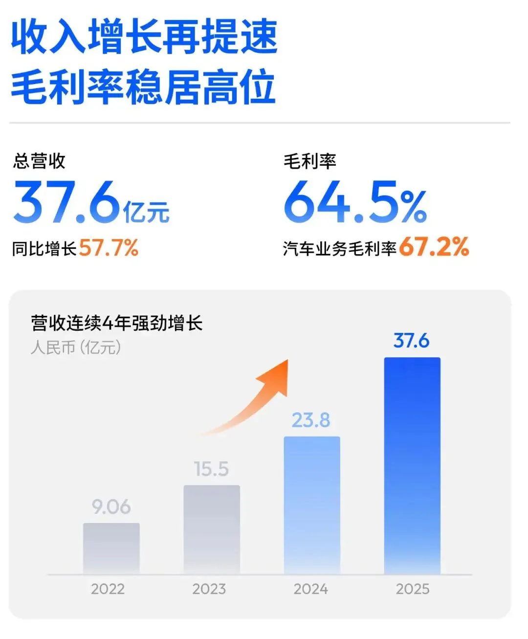 得益于前面提到的这些积极的商业进展,我们在报告期内实现了37.6亿元的营收,同比增长57.7%,综合毛利率64.5%,其中汽车业务收入占比接近95%,并延续了67.2%的高毛利率水平;