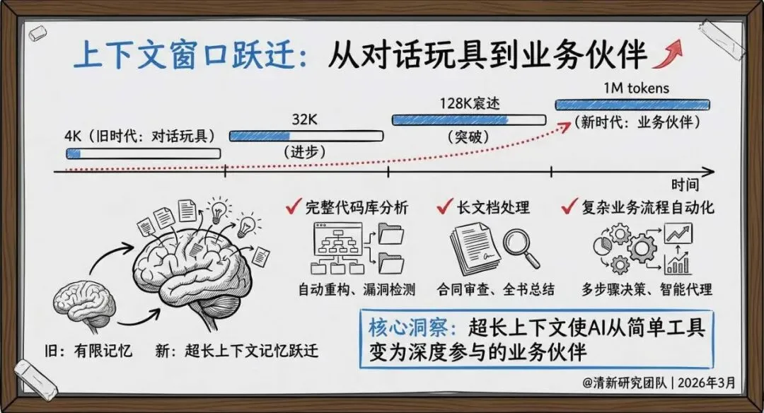 上下文窗口实现从 4K 到 1M tokens 的跃迁,支持长文档处理、复杂业务流程自动化等深度应用;