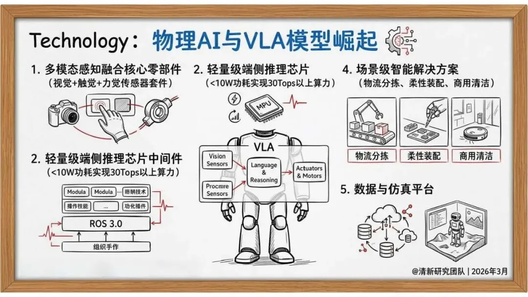 物理 AI 与 VLA 模型崛起,融合多模态感知、轻量级芯片、场景级解决方案,推动物流分拣、柔性装配等工业应用。