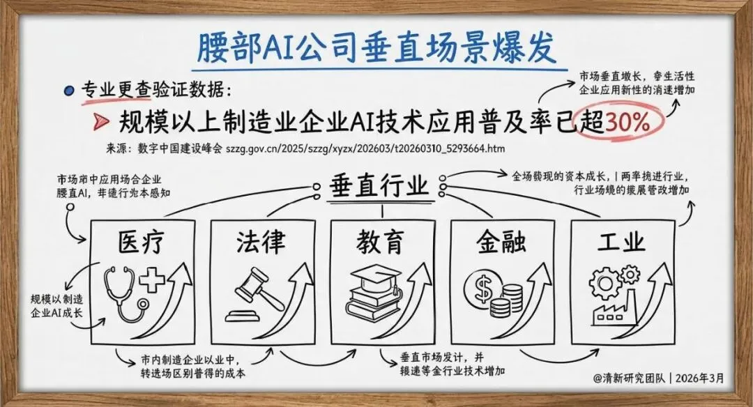 腰部机会:垂直场景成为核心增长点,医疗、法律、金融、工业等领域的腰部 AI 公司凭借专业能力快速发展;