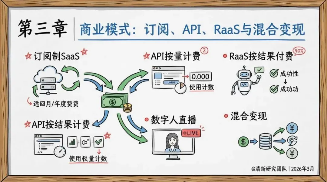 行业形成订阅制、API 按量计费、RaaS 按结果付费三大核心模式,并出现混合变现趋势,商业化范式持续升级: