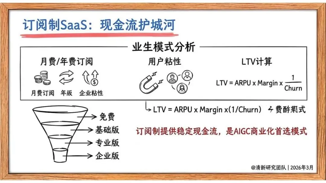 订阅制 SaaS:作为现金流护城河,通过多版本分级(免费 / 基础 / 专业 / 企业)提升用户粘性,是 AIGC 商业化首选;