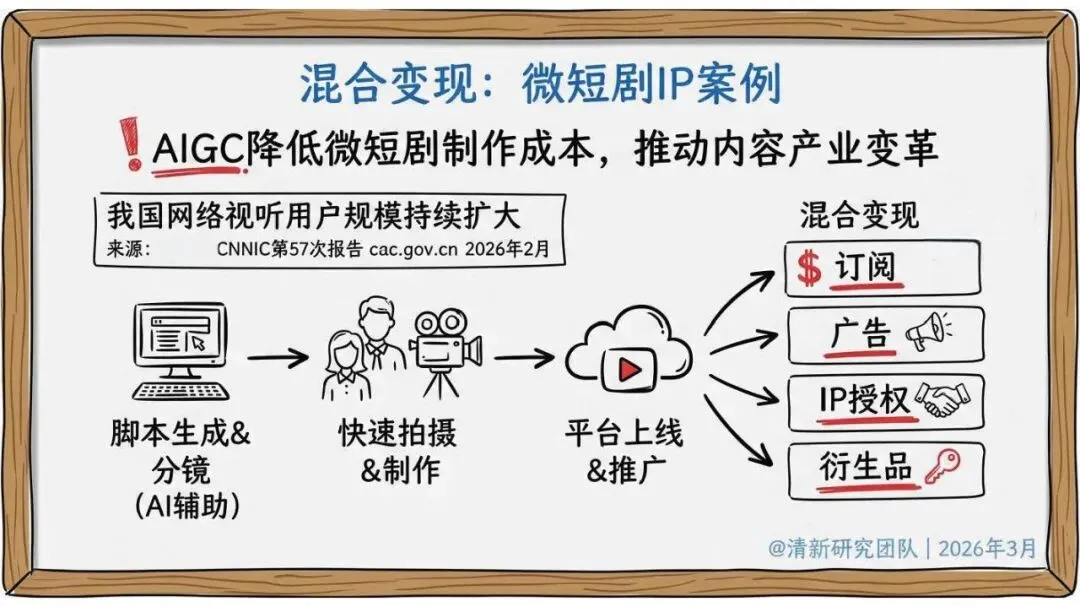 混合变现:以微短剧 IP 为典型案例,AI 降低全流程制作成本,通过订阅、广告、IP 授权、衍生品实现多元盈利。