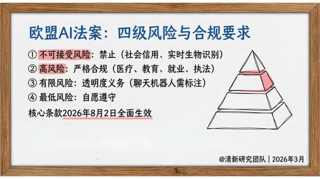 欧盟 AI 法案:2026 年 8 月核心条款生效,按风险分四级监管(不可接受风险禁止、高风险严格合规、有限风险强调透明、最低风险自愿遵守);