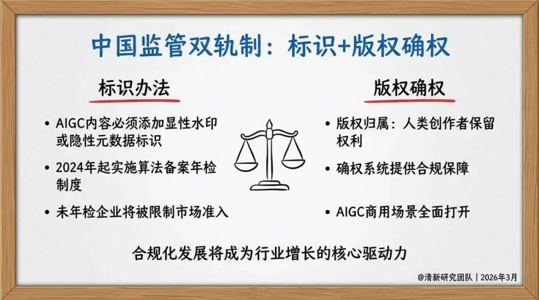 中国双轨制:实施标识 + 版权确权,AIGC 内容需添加水印 / 元数据标识,算法备案年检制落地,人类创作者保留版权,确权系统打开商用场景;