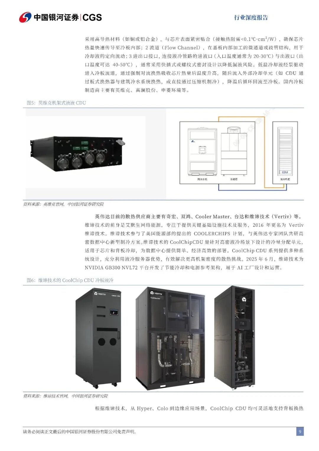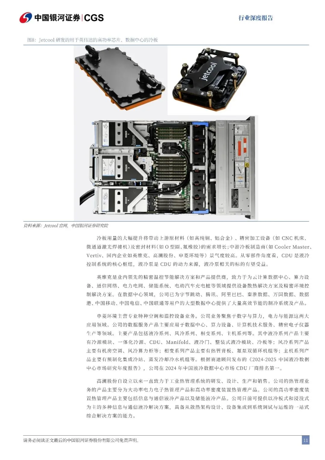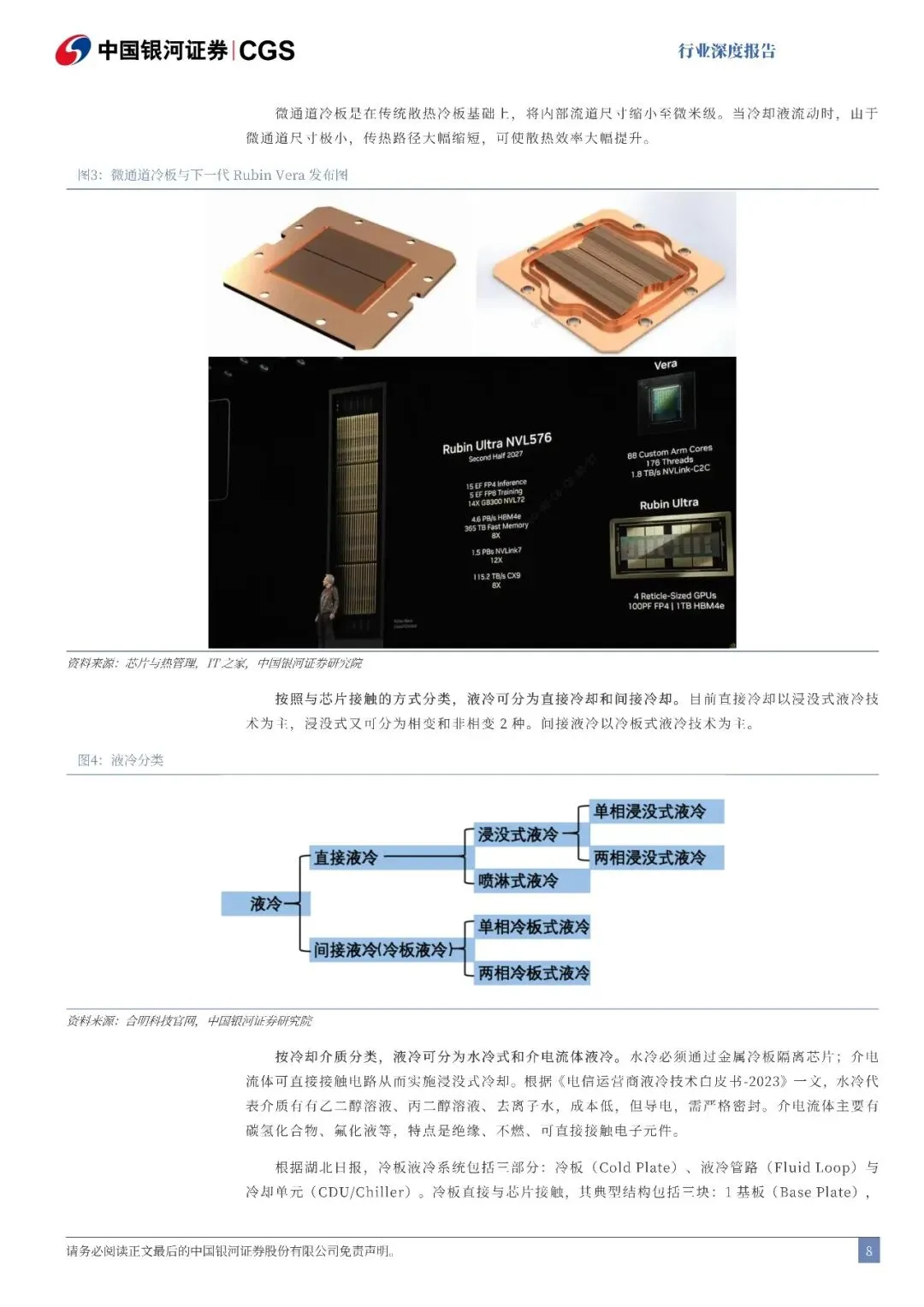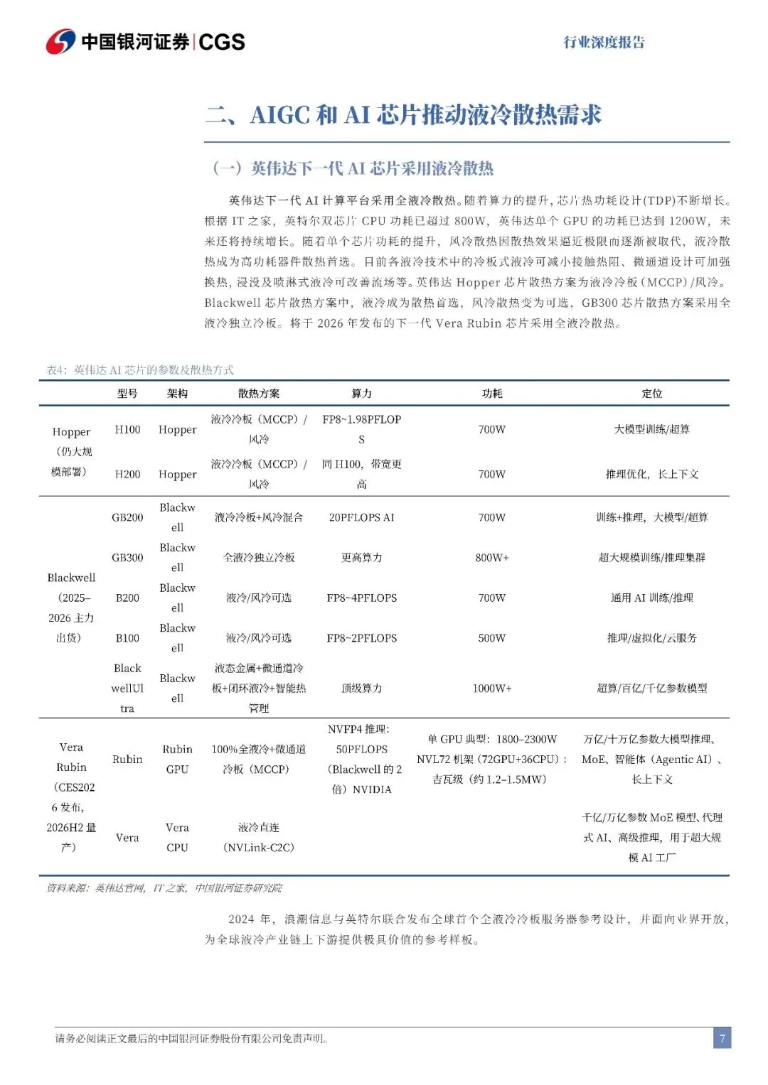 AIGC驱动高功率芯片爆发,全液冷散热成为主流。随着AIGC的爆发,高功率芯片的热流密度大幅增长,传统风冷散热逼近物理极限,液冷成为高功率芯片散热首选。英伟达Hopper芯片散热方案为液冷冷板(MCCP)/风冷。Blackwell芯片散热方案中,GB300芯片散热方案采用全液冷独立冷板。下一代VeraRubin芯片采用全液冷散热。英伟达目前海外的散热供应商主要有奇宏、双鸿、CoolerMaster、台达和维谛技术(Vertiv)等。冷板用量的大幅提升将带动上游原材料(如高纯铜、铝合金)、精密加工设备及密封材料的需求增长;中游制造商(如CoolerMaster、Vertiv、英维克、高澜股份、申菱环境、同飞股份等)有望受益。