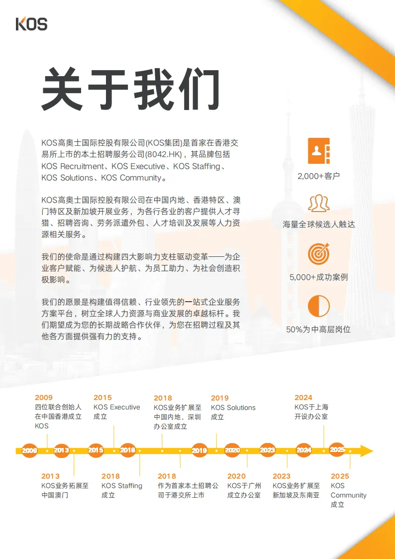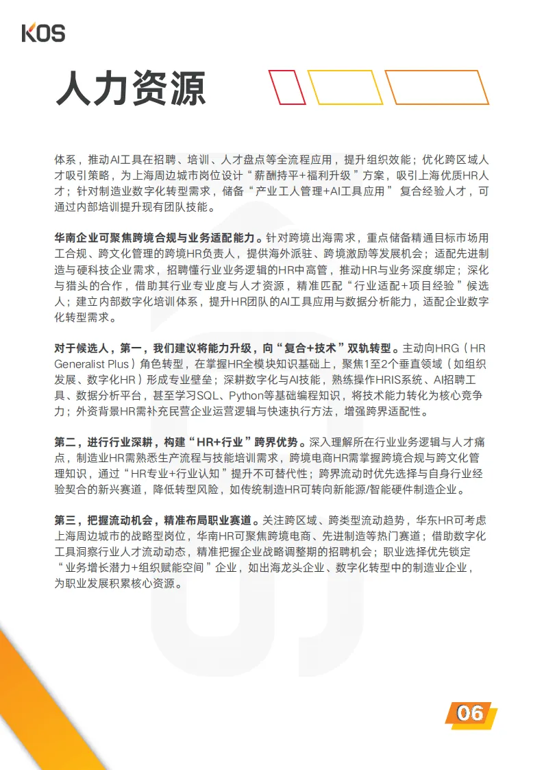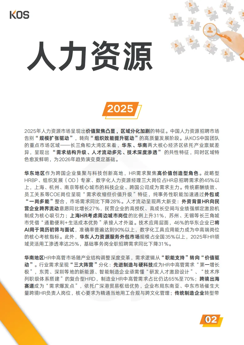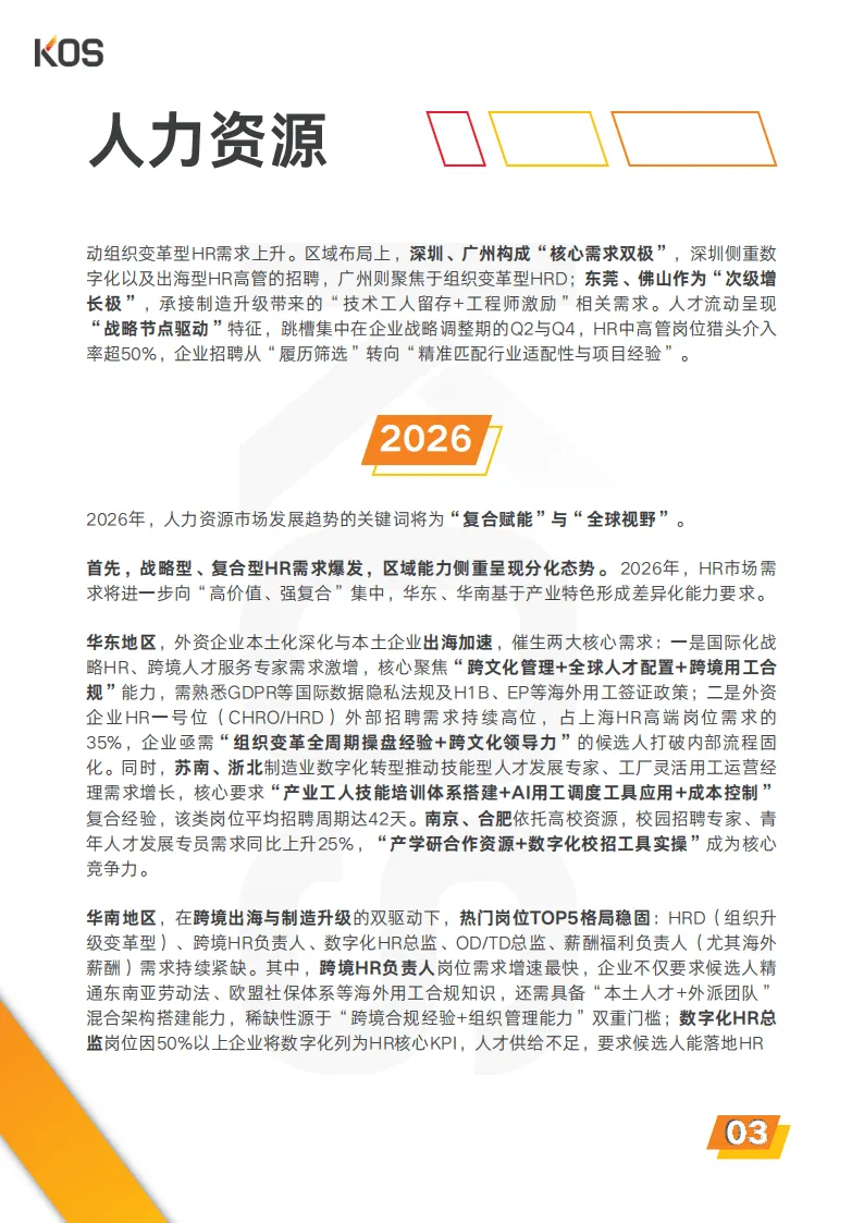 《2026中国人才市场招聘趋势报告》由KOS高奥士国际发布,聚焦人力资源、财务、法务合规、新兴科技等十一大领域,梳理2025年招聘特征并前瞻2026年趋势,指出中国人才市场正迈入以复合能力、全球视野与技术赋能为核心的新阶段,企业招聘从补充人力升级为嵌入战略的系统性工程,候选人的能力升级与赛道选择成为职业发展关键。