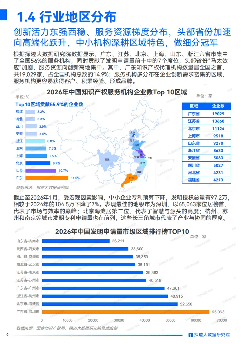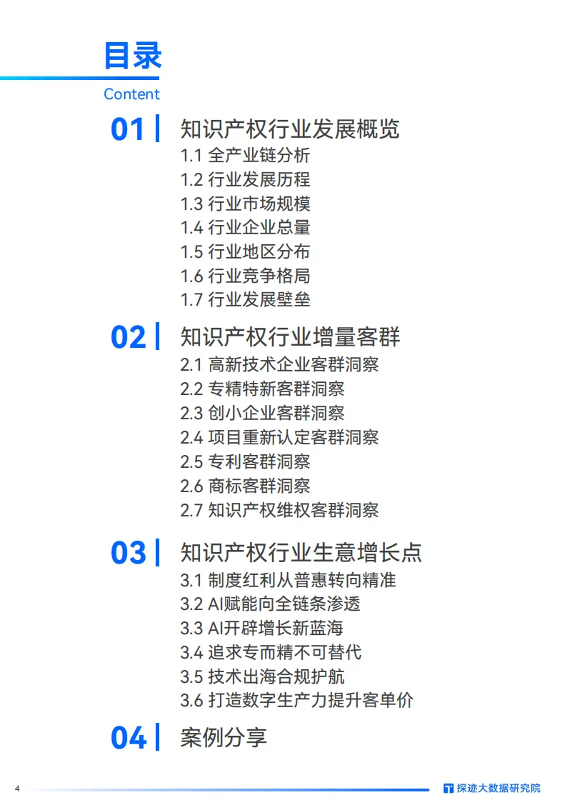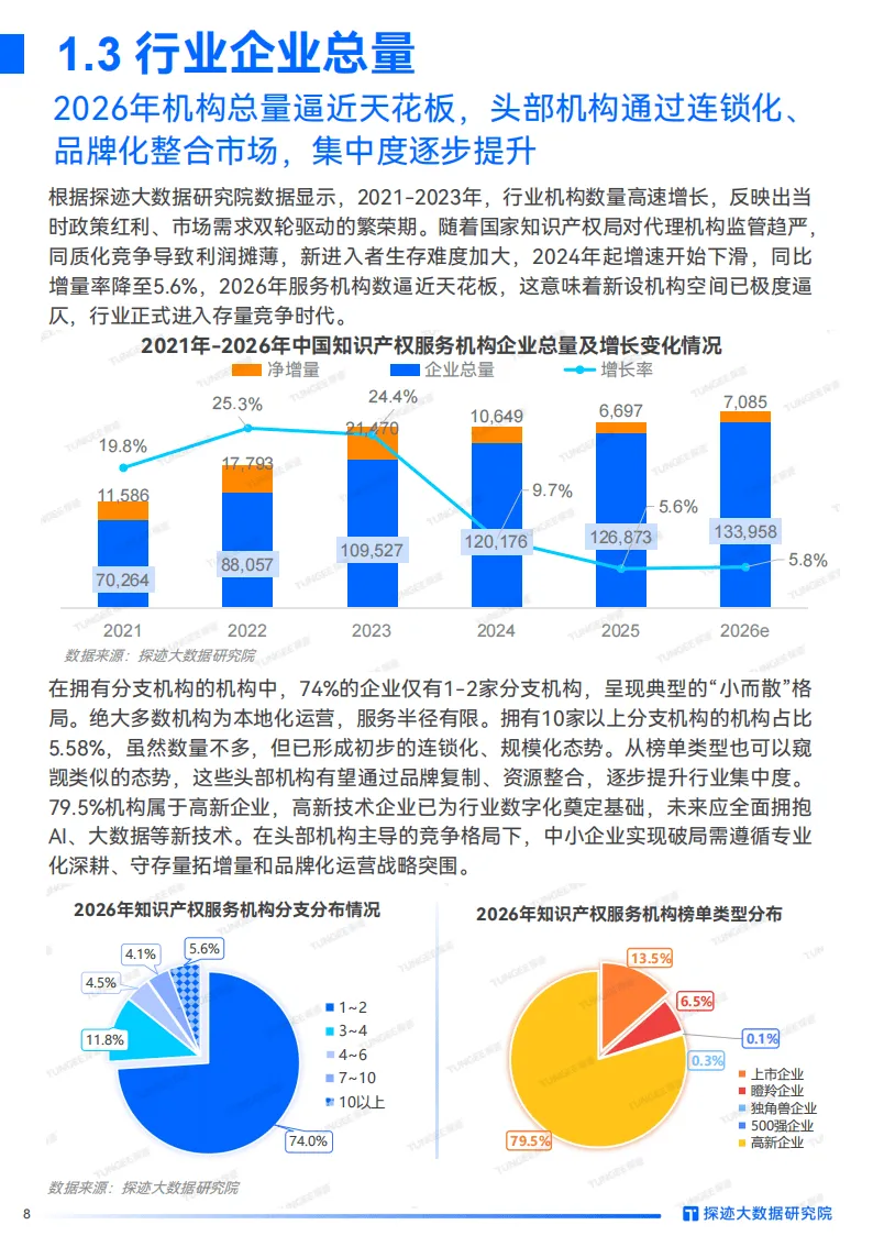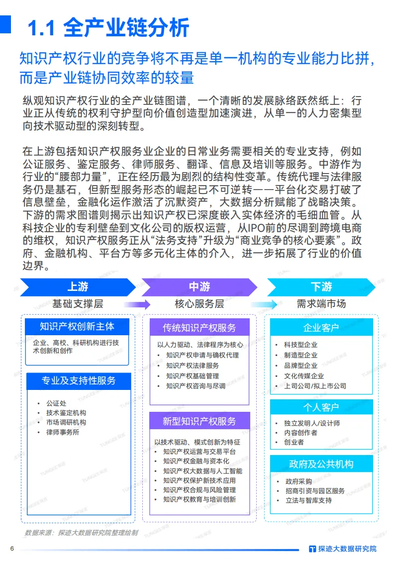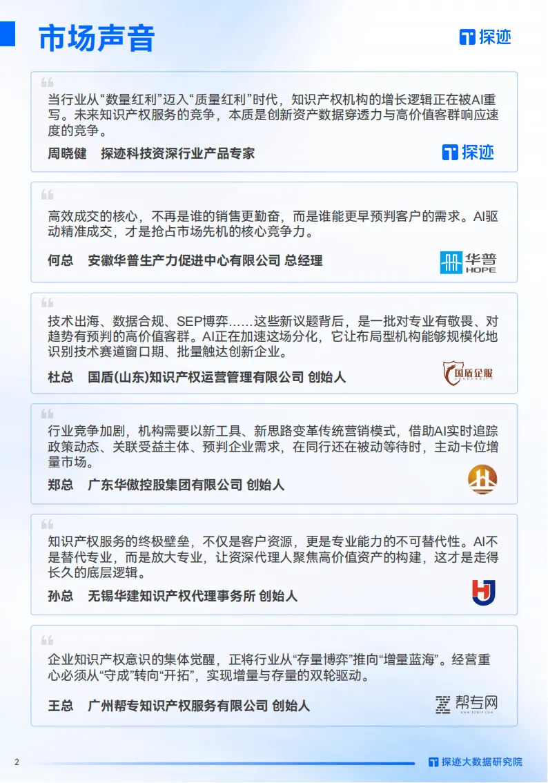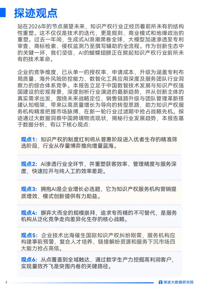 2026年知识产权行业正迎来由AI驱动的结构性重塑,行业从“数量红利”迈入“质量红利”时代,竞争核心转向创新资产数据穿透力与高价值客群响应速度,传统发展逻辑被彻底改写。探迹大数据研究院的这份报告指出,行业制度红利从普惠进入精准筛选阶段,低质申请、投机型机构逐步退场,行业从存量博弈转向增量蓝海,高质量专利资产与专业服务成为核心竞争力。