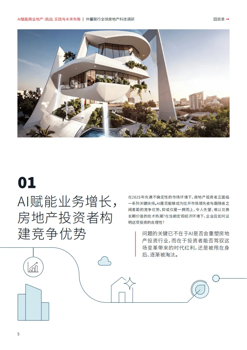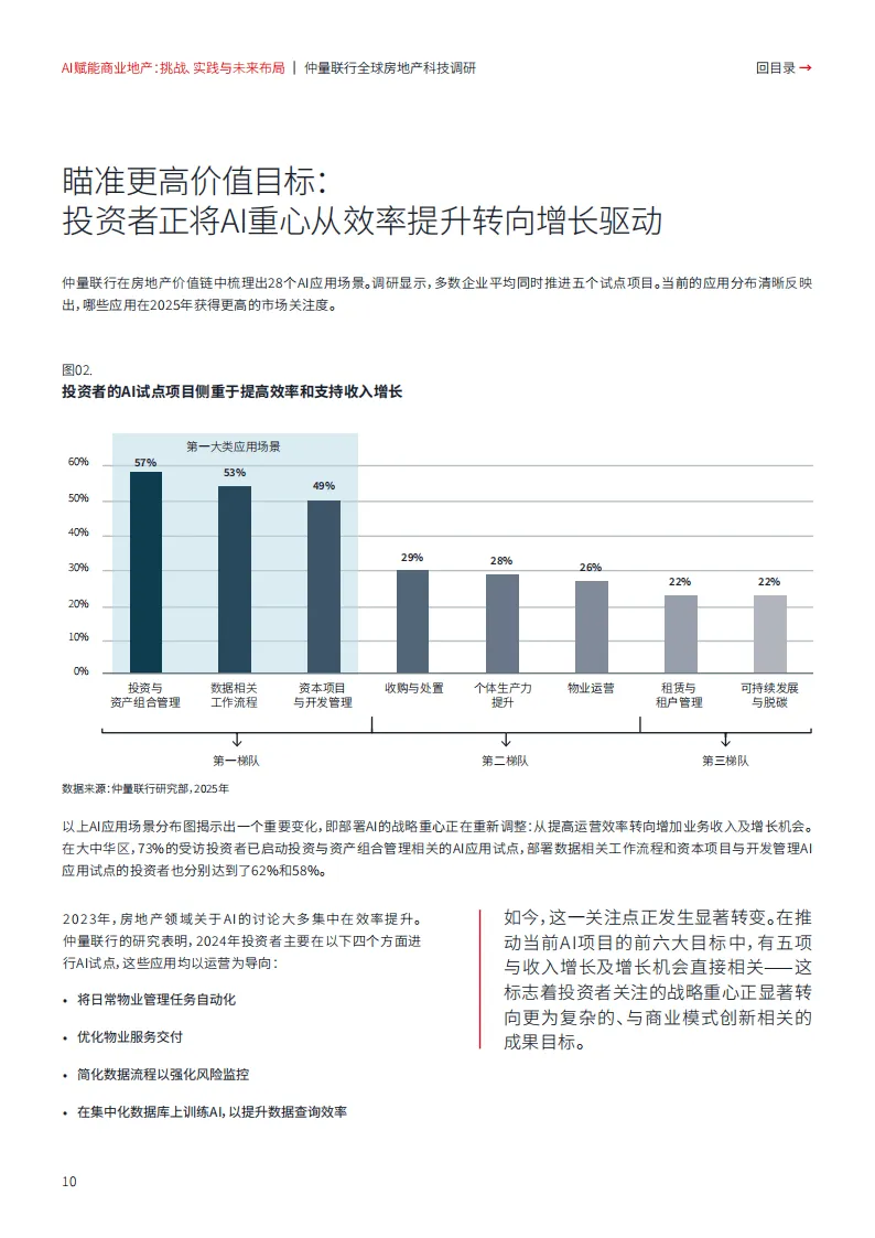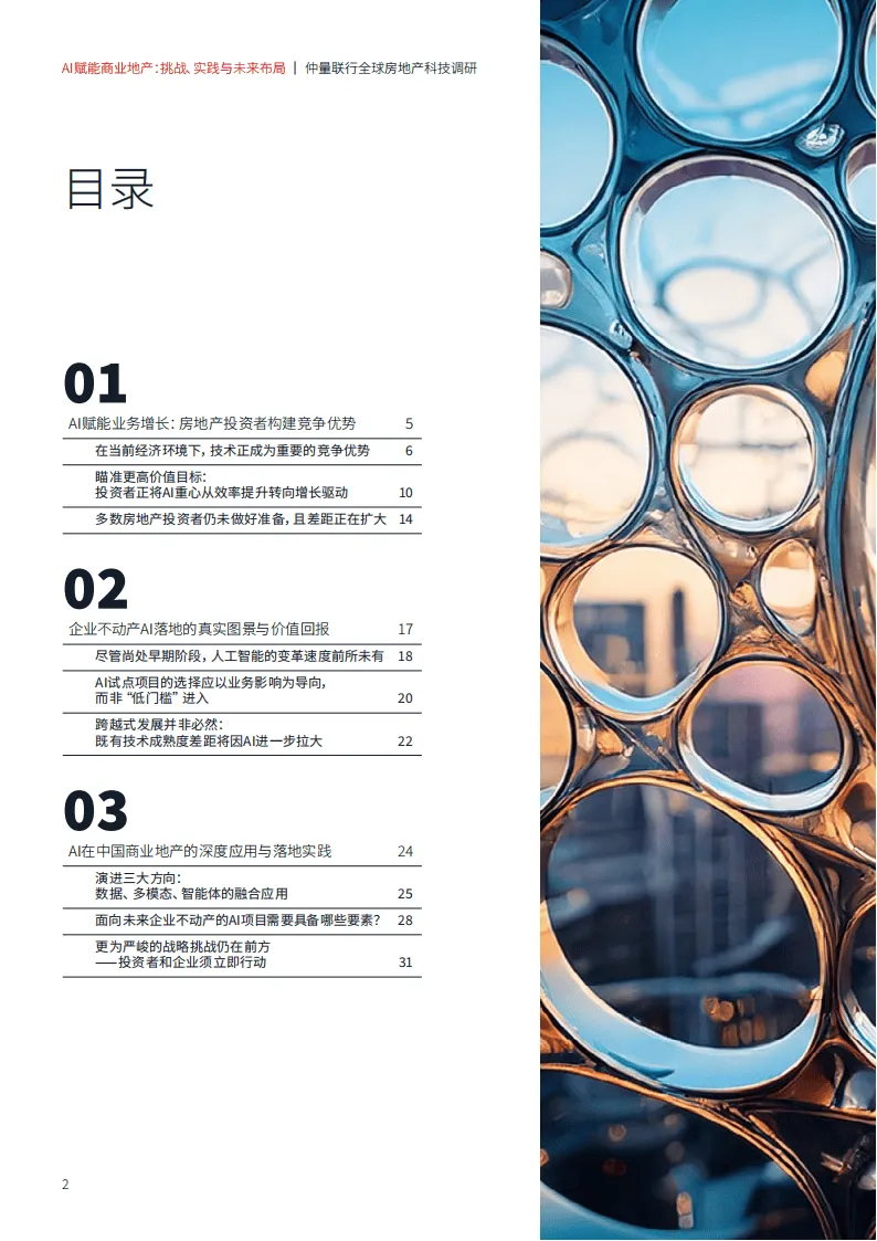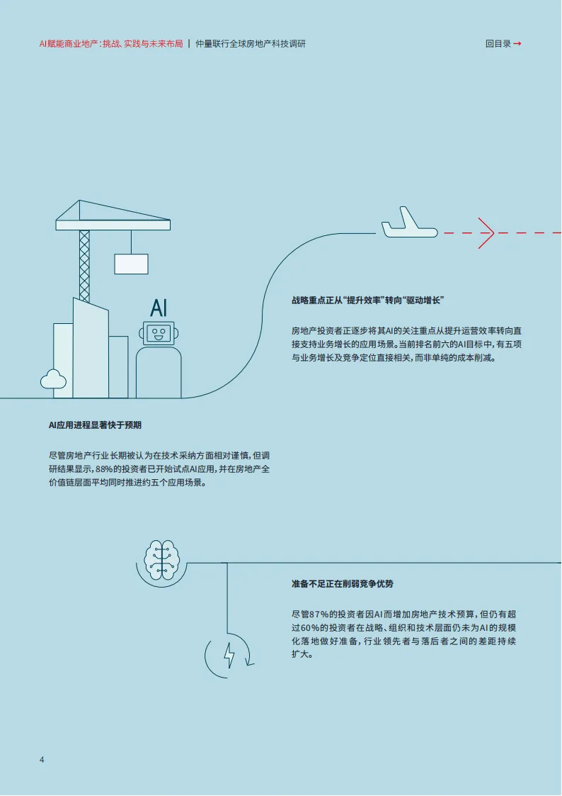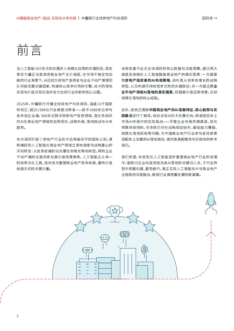 仲量联行2026年全球房地产科技调研聚焦AI赋能商业地产的发展现状、实践路径与未来趋势,基于覆盖16个国家和地区的1500余位行业高层决策者调研数据,解析了AI在房地产投资和企业不动产领域的落地图景,尤其针对中国商业地产的AI应用特征给出了针对性洞察。
