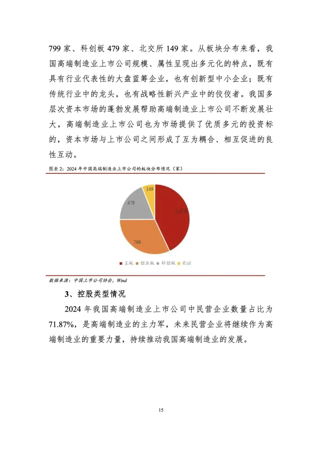 :2024 年末 A 股高端制造业上市公司达 2503 家,占 A 股总数 46.50%,近 5 年复合增长率 10.80%,高于 A 股整体增速。资产规模达 27.24 万亿元,近 5 年复合增长率 13.98%;营业收入 15.41 万亿元,复合增长率 13.27%,显著高于 GDP 增速。民营企业占比 71.87%,是行业主力军;国有企业虽数量占比 17.58%,但收入占比达 34.31%,发挥 “产业链链长” 引领作用。广东、江苏、浙江为上市公司主要聚集区,机械制造、电子、电力设备行业企业数量居前三位。 - 研发创新投入加码,核心技术突破成效显著