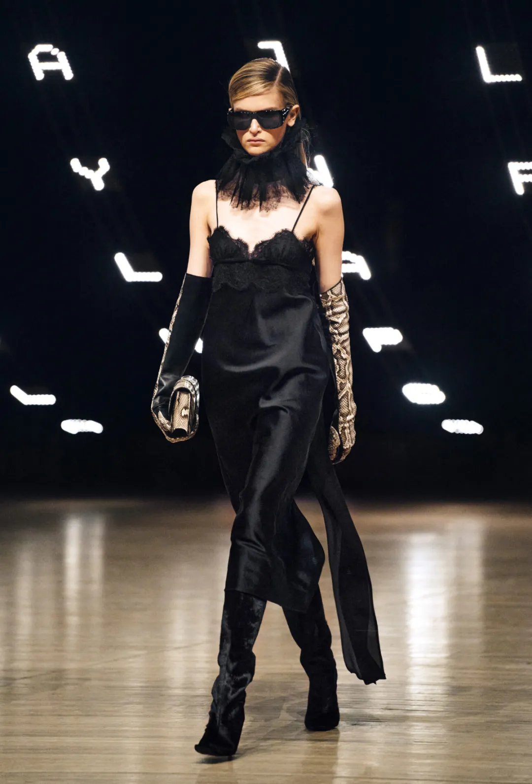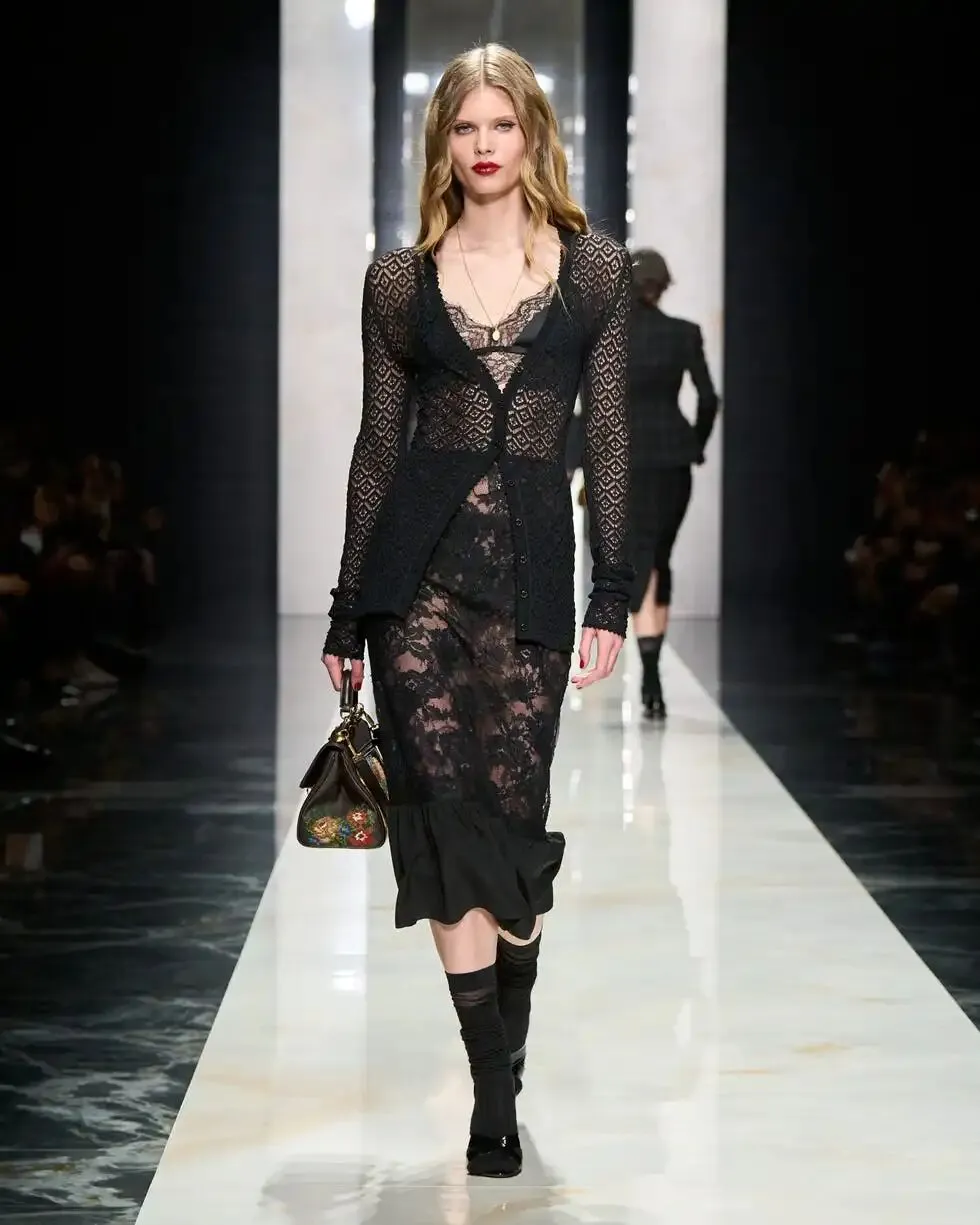 从精致的黑色蕾丝礼服到蕾丝皮草拼接细节,再到蕾丝叠层结构,蕾丝不再只是装饰材料,而成为整体造型的重要组成部分。在Alexander McQueen、Dolce & Gabbana以及Saint Laurent的系列中,都可以看到蕾丝被大面积使用。