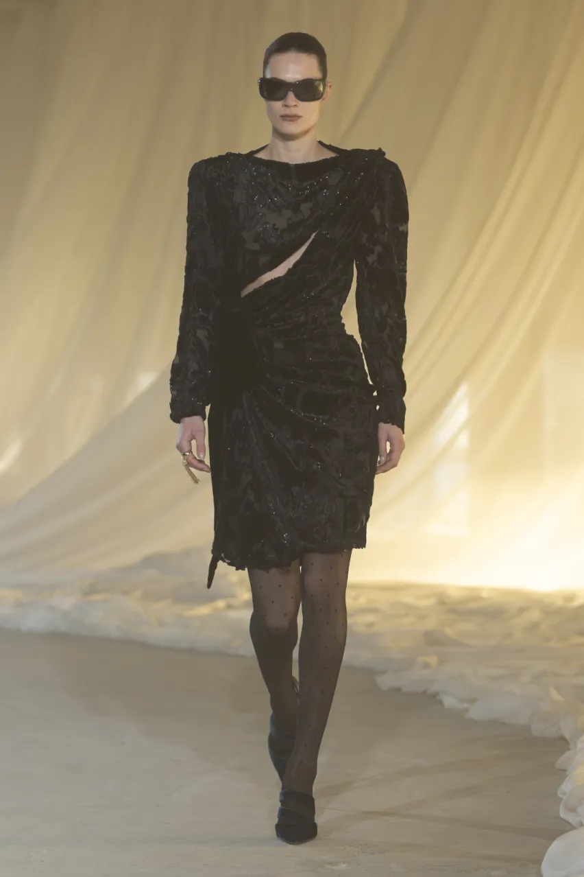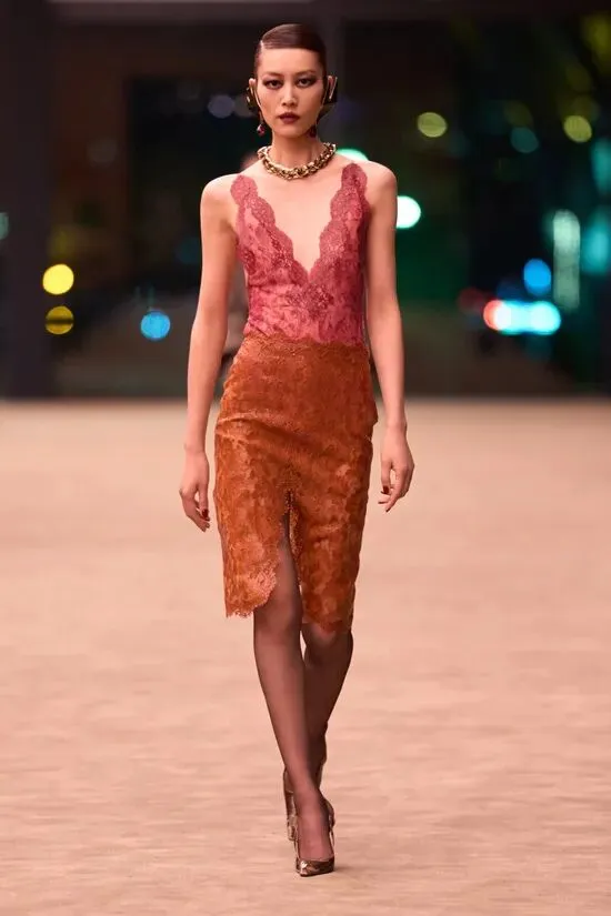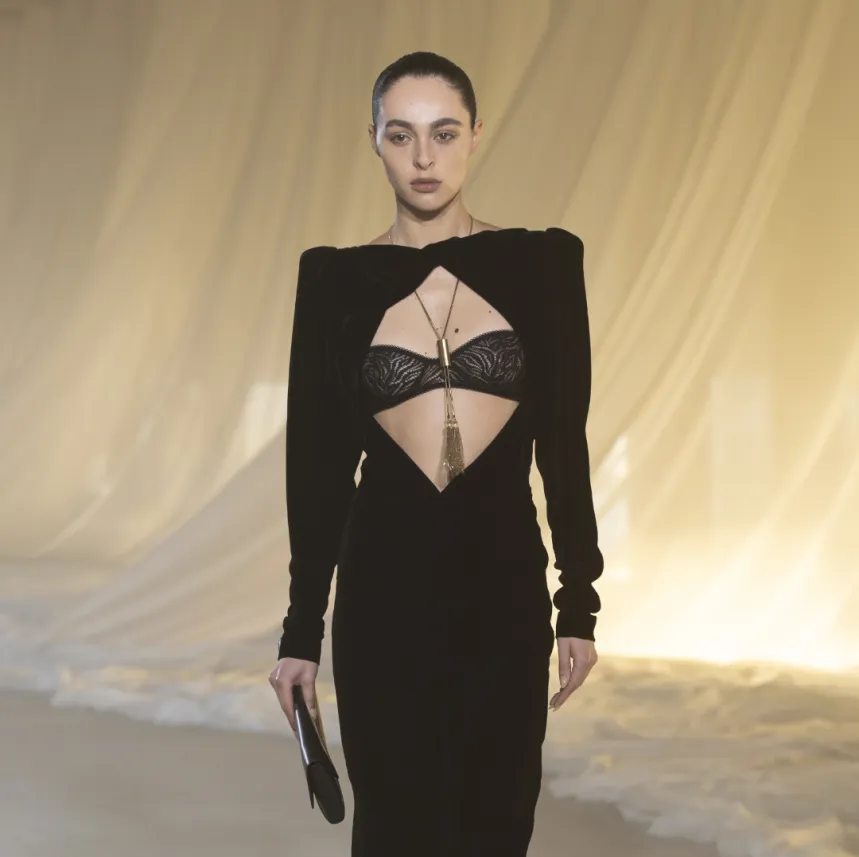 设计师不再只是通过廓形表达风格,而是越来越多地借用来自贴身服饰领域的设计语言——蕾丝、束身结构、腰线塑造、透明层次等元素,正在成为时装叙事的重要部分。