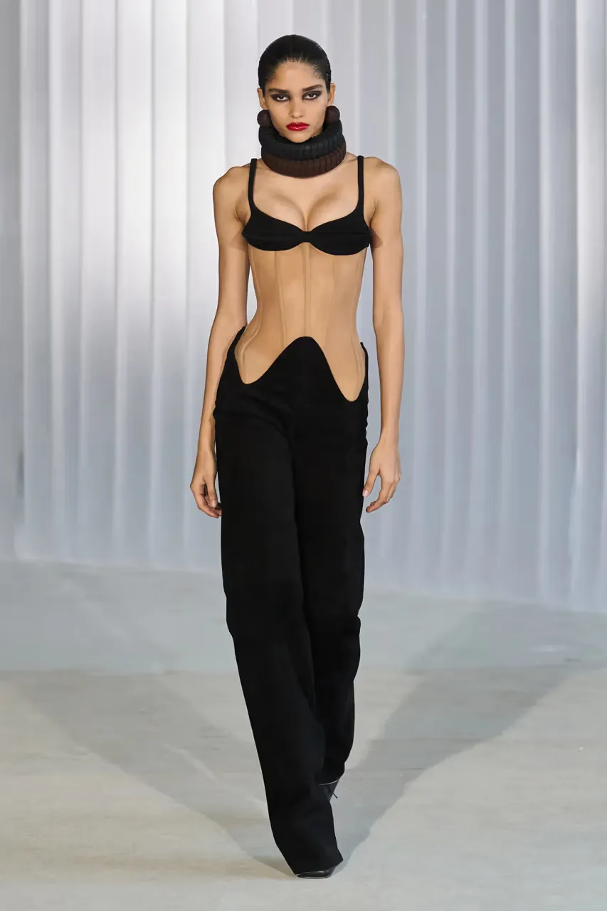 许多品牌通过束身结构或特殊剪裁来强化腰线,使身体轮廓更加立体。例如在Jacquemus、Jean Paul Gaultier以及Dior的系列中,可以看到明显的低腰弧形结构(Basque Waist)或强调腰部曲线的设计。