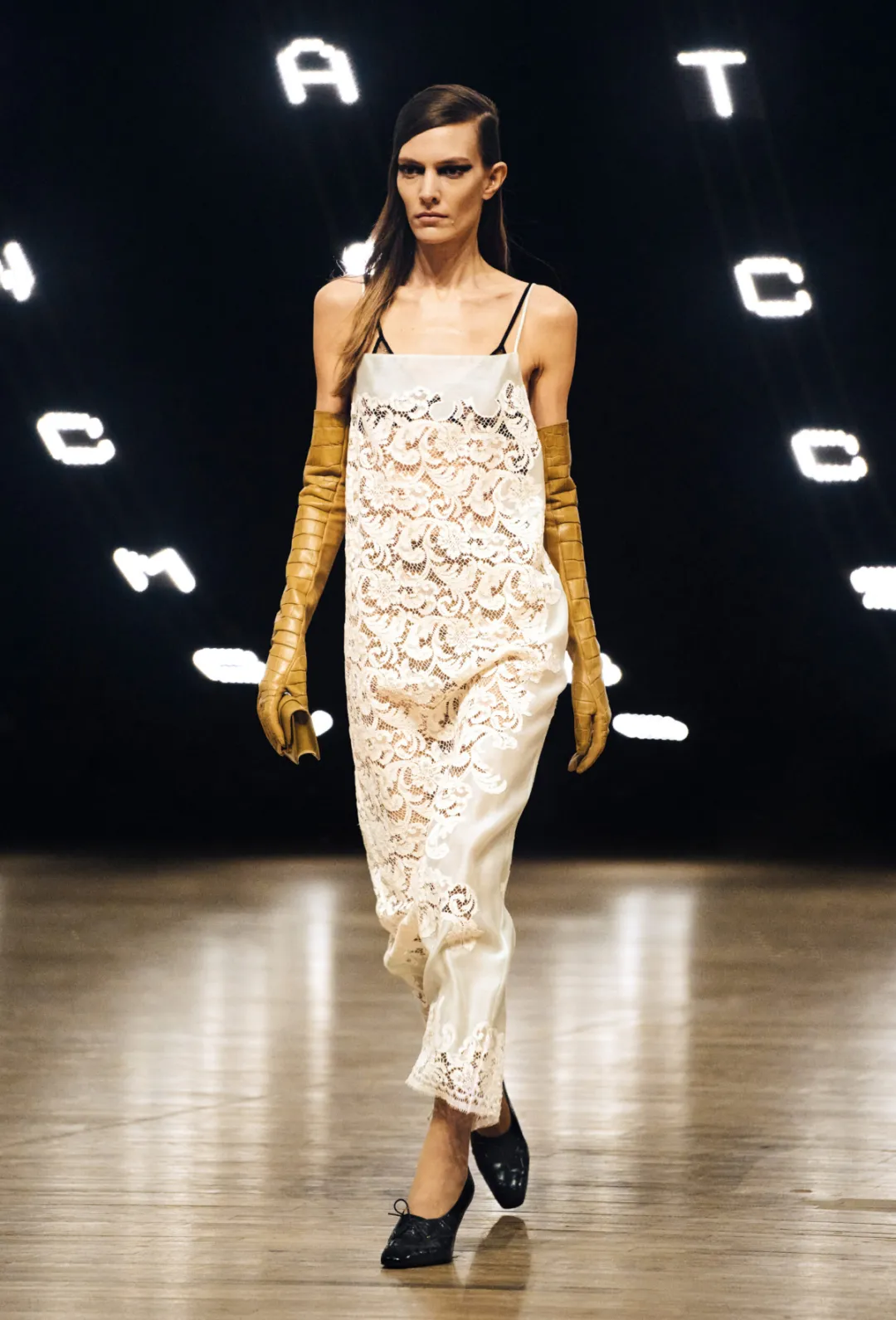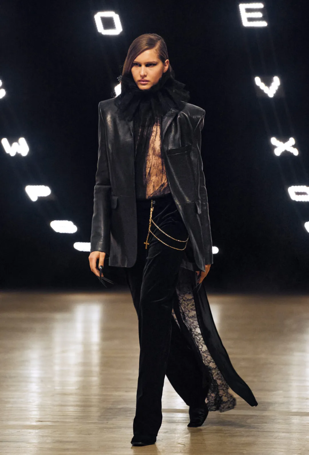 FW26秀场中还出现了一种非常有趣的材质组合:皮革与蕾丝的对比。