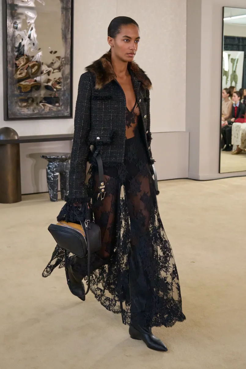 浪漫女性气质重新成为设计的重要表达方式。蕾丝、透明材质以及柔软结构在多个品牌系列中频繁出现,使内衣式美学再次进入成衣设计体系。