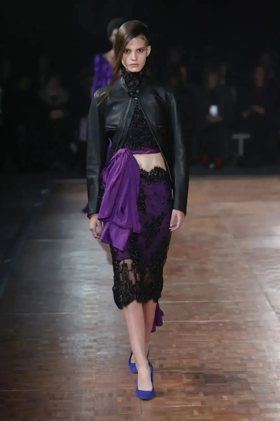 皮革外套搭配蕾丝裙,结构外衣下露出蕾丝层次
