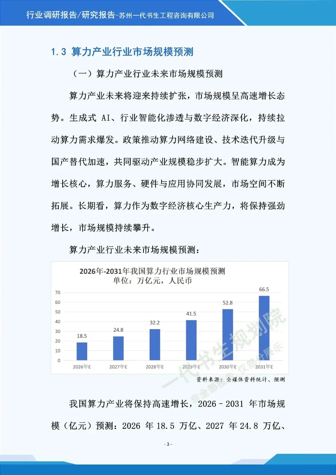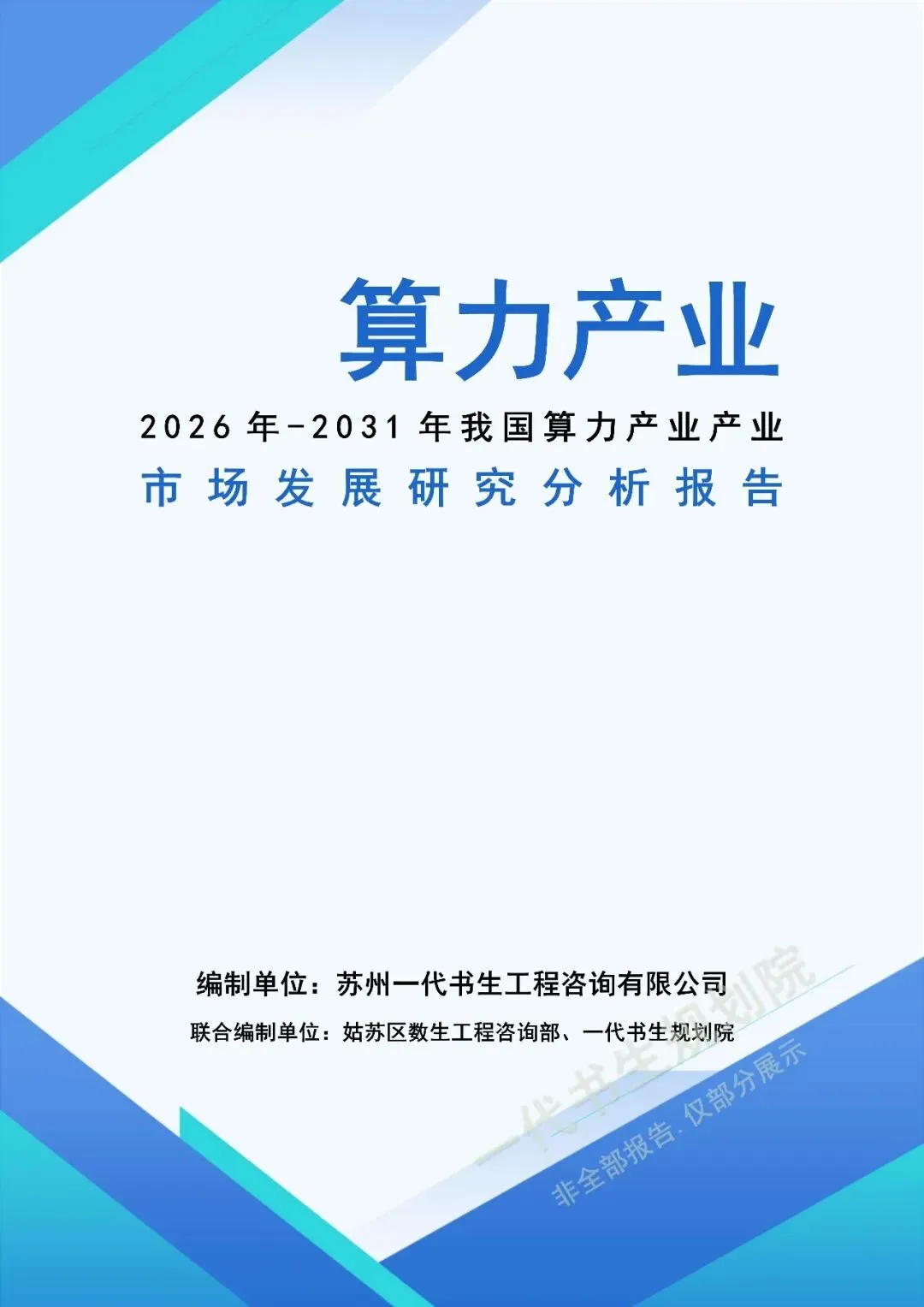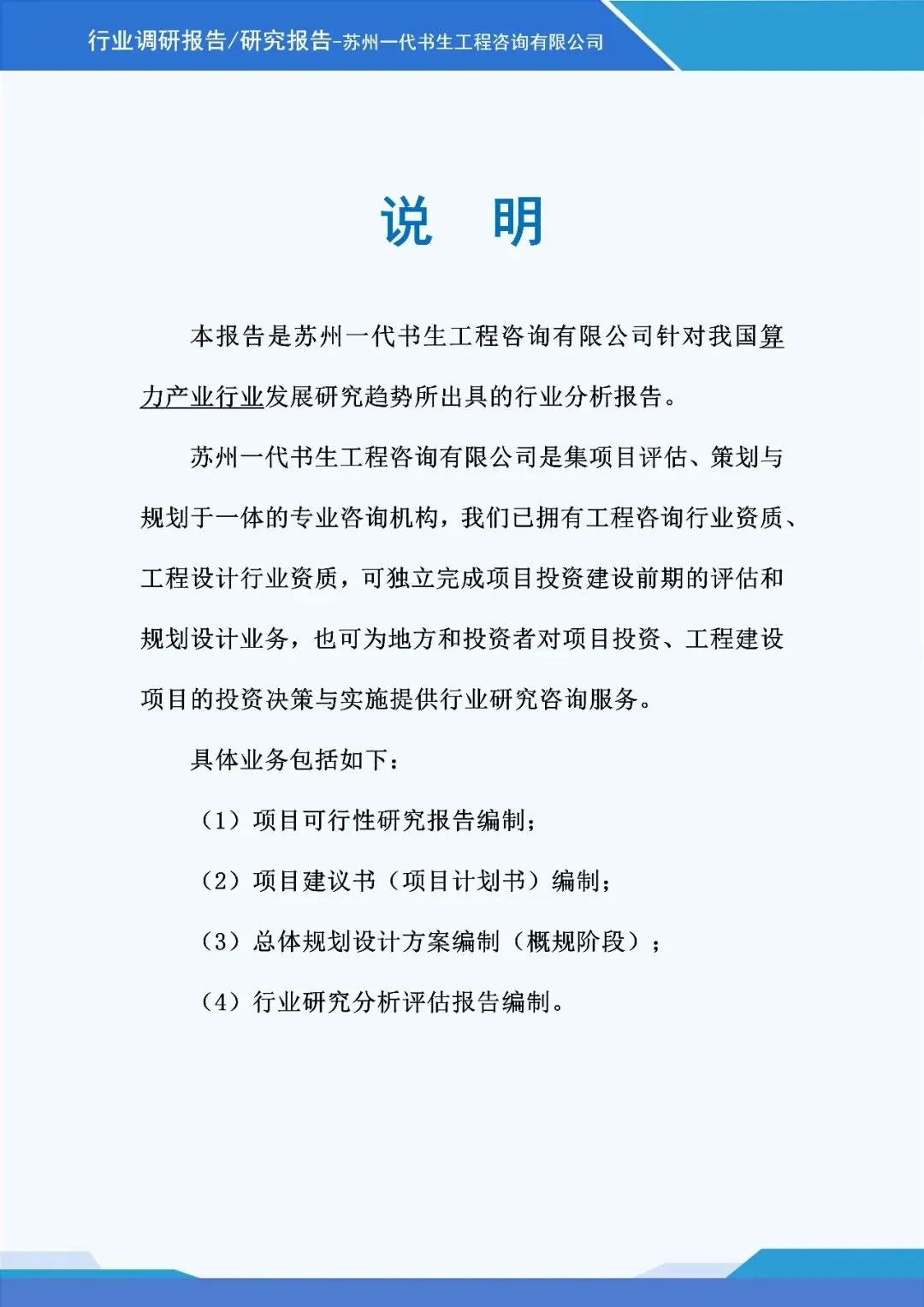 《2026年-2031年我国算力行业市场分析调研报告》由苏州一代书生工程咨询有限公司出具,该公司集市场评估、产业策划与规划设计于一体,可提供项目建设前期评估、落地规划设计等服务,出具各类行业报告及规划方案,保障报告专业性与实用性。报告聚焦行业市场分析,从三个核心方向明确编制要点,核心如下: