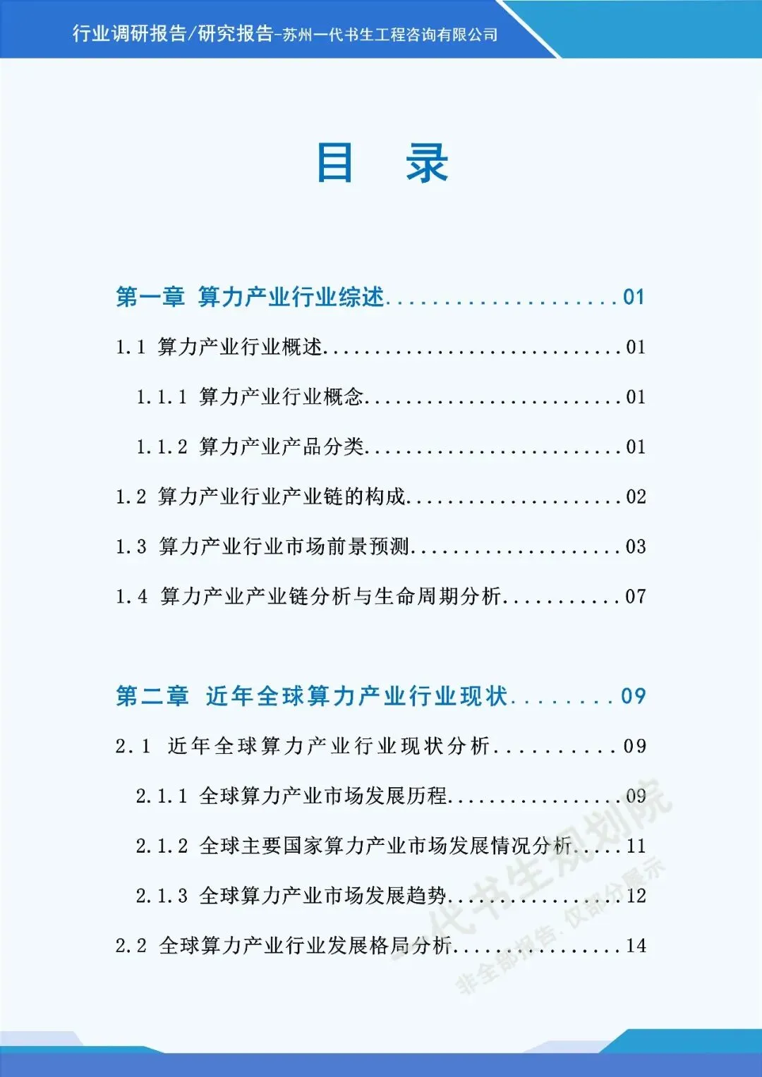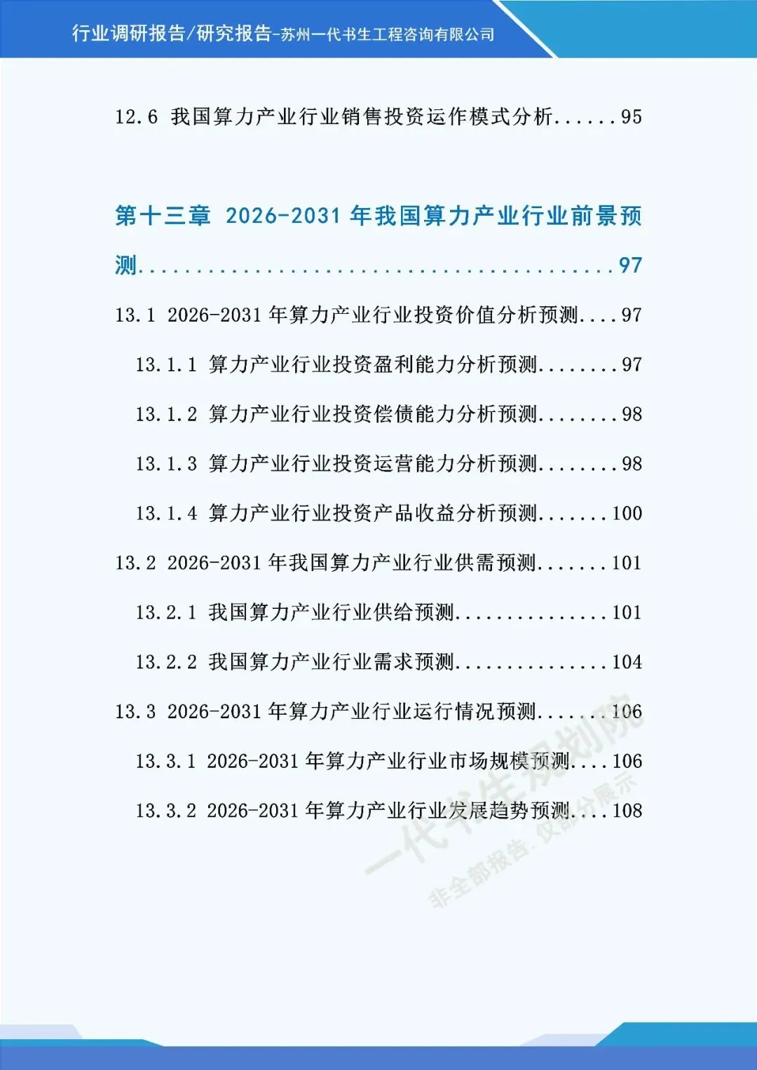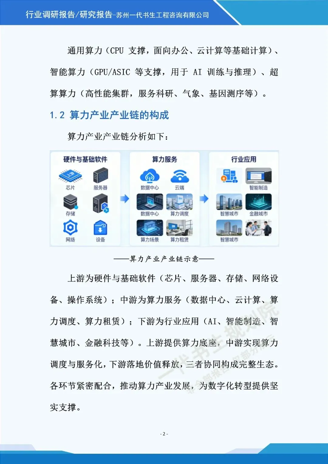 《2026年-2031年我国算力行业市场分析调研报告》由苏州一代书生工程咨询有限公司出具,该公司集市场评估、产业策划与规划设计于一体,可提供项目建设前期评估、落地规划设计等服务,出具各类行业报告及规划方案,保障报告专业性与实用性。报告聚焦行业市场分析,从三个核心方向明确编制要点,核心如下: