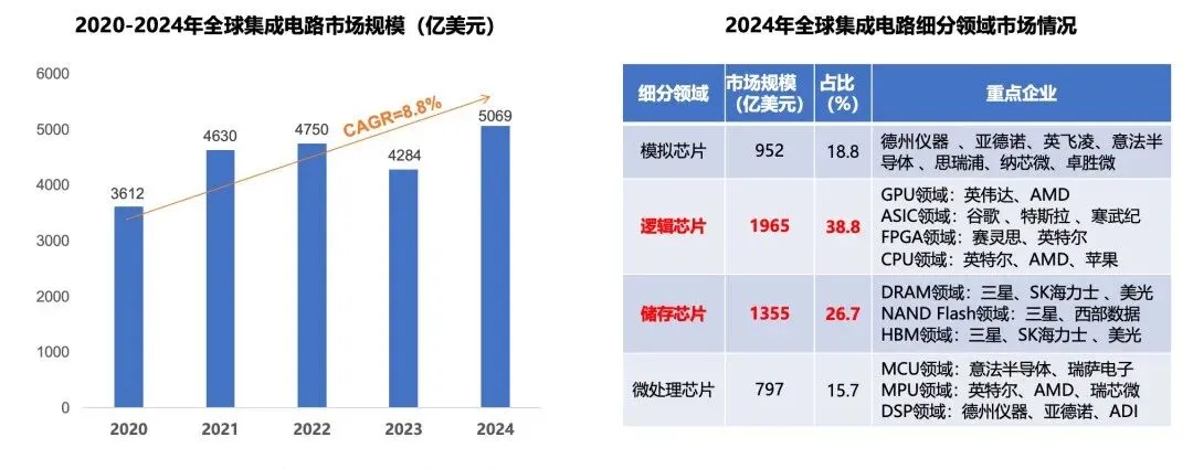从细分领域来看,当前市场需求高度集中,逻辑芯片和储存芯片成为核心驱动力,2024年这两大芯片的市场规模合计占全球集成电路比重的65.5%。其中,逻辑芯片市场规模1965亿美元,占比38.8%;储存芯片市场规模1355亿美元,占比26.7%。