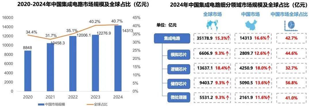 从整体数据来看,2024年中国集成电路市场规模达到14313亿元,全球占比42.7%;模拟芯片、逻辑芯片、储存芯片、微处理器等领域也均保持两位数的增长,展现出强大的市场韧性和增长潜力。