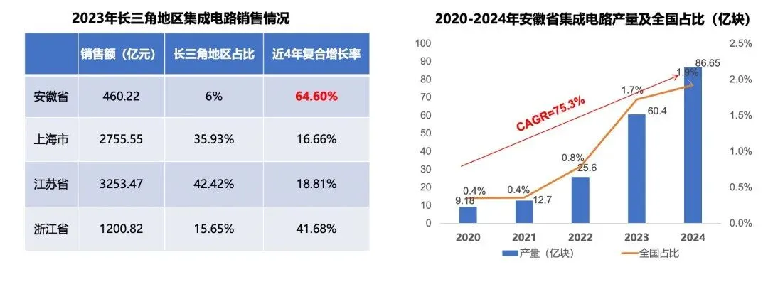 长三角区域方面,安徽则正以惊人的速度实现向上追赶,2023年,安徽省集成电路销售额为460.22亿元,在长三角地区占比仅6%,规模虽不及上海、江苏,但增长势能一骑绝尘—— 从数据上可以看出,安徽近4年复合增长率高达64.60%,远超上海的16.66%、江苏的18.81% 和浙江的41.68%,是长三角区域中增速最快的省份,展现出了极强的后发优势。