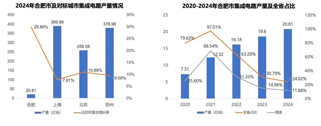 省内发展趋势层面,2020到2024年,合肥集成电路产量从7.31亿块稳步提升至20.81亿块。不过这里需要注意的是,自2021年起,合肥的产量增速开始逐步放缓——2021年增速高达68.54%,到2024年已回落至11.88%;全省占比也从2021年的 97.01%,回落至2024 年的24.02%,这反映出合肥在产业规模持续扩大的同时,增长动能有所减弱。