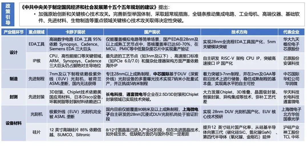 同时,依据前文对集成电路产业链的分析,当前我国集成电路产业在设备材料、设计、制造和封测等环节存在多处“卡脖子”环节,所以十五五期间,我国集成电路产业的发展方向根据当前国产现状更加需要去做对应的攻坚突破。例如,设计环节高端数字电路EDA 工具95% 依赖Synopsys、Cadence、Siemens EDA 三大巨头,我国仅能覆盖模拟电路等简单场景,未来需要实现28nm全流程EDA工具国产化,5nm 关键模块突破;先进制程领域,7nm及以下制程依赖极紫外线(EUV)光刻机,被荷兰ASML垄断,国内无法获得。十五五期间,要着力突破3-7nm制程,并在2nm及GAA等前沿技术上进行储备,稳住成熟制程的基本盘,实现高水平的自主可控。先进封装领域,3D封装、Chiplet技术依赖美国应用材料、日本Disco设备,环氧树脂等封装材料依赖进口,我国应大力发展Chiplet、3D堆叠、晶圆级封装、倒装封装、异构集成等技术,弥补工艺代差。