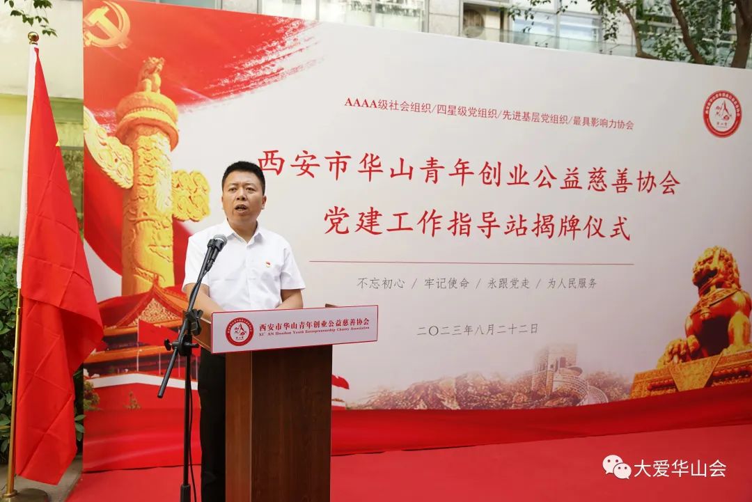 2023年8月22日上午,西安市华山青年创业公益慈善协会举行了党建工作指导站揭牌仪式并取得圆满成功。西安市民政局社会组织管理局局长、社会组织党委书记杨国平,华山会名誉会长、西安建工集团副总裁、西安建工绿色建筑集团有限公司党委书记、董事长陈震,高新区党工委党群工作部、机关党委党建主管钱佳睿,西安唐城医院党委书记郑瑞世,西北大学中东研究所所长李福泉,西安市定边商会党支部书记曹一鸣,西安市西商联合会会长于建安,西安高新区新联会理事长贺晓兵,西安市宿州商会会长路世新,社区监委会主任陈超,陕西省帮帮乐乡村发展协会会长卞爱,以及华山会友好商协会会长,指导站各成员单位党支部书记、会长等人参加了揭牌仪式。西安市旬邑商会会长宋涛,西安市旬邑商会副秘书长张明应邀参加此次活动。