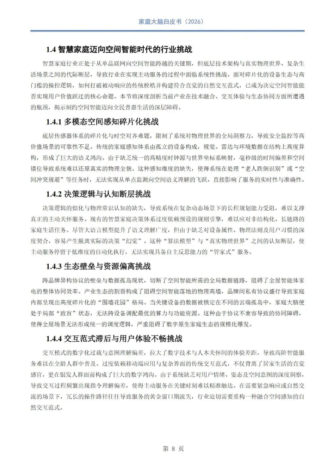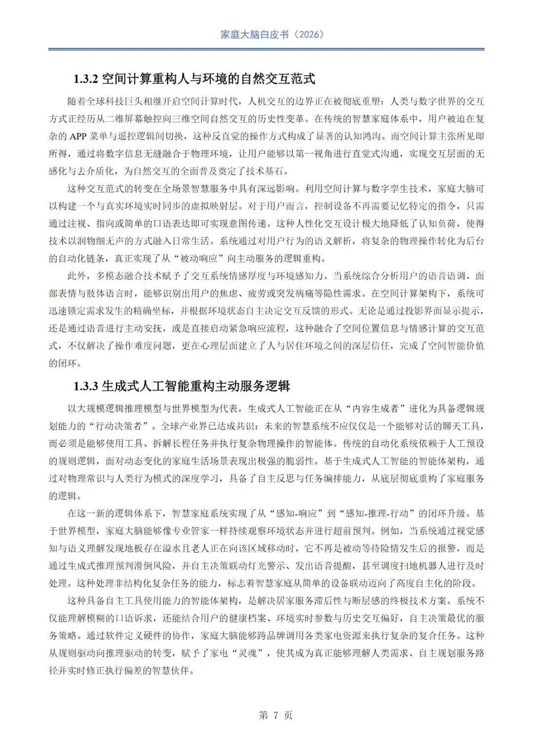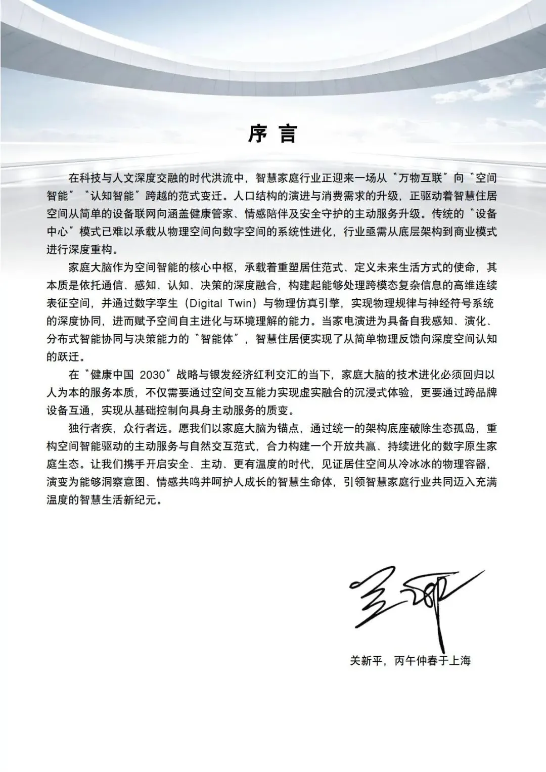 当前智慧家庭行业正从万物互联向空间智能、认知智能深度转型,在国家战略、人口结构与消费升级的多重驱动下,传统设备联网模式难以满足全龄化、主动式服务需求,行业面临感知碎片化、认知断层、生态壁垒、交互滞后等核心挑战。家庭大脑作为空间智能核心中枢,依托通信、感知、认知与决策深度融合,以数字孪生、具身智能、多模态交互为技术底座,构建跨品牌互通、本地数据闭环、主动服务的数字原生家庭生态,推动居住空间从物理容器向具备意图洞察、情感共鸣与全生命周期呵护能力的智慧生命体演进。本报告系统阐述家庭大脑技术架构、场景实践、商业路径与未来方向,为空间智能落地与行业协同发展提供理论支撑与实践参考。