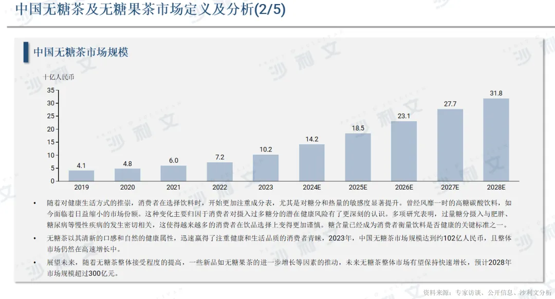 展望未来,随着无糖茶整体接受程度的提高,一些新品如无糖果茶的进一步增长等因素的推动,未来无糖茶整体市场有望保持快速增长,预计2028年市场规模超过300亿元。