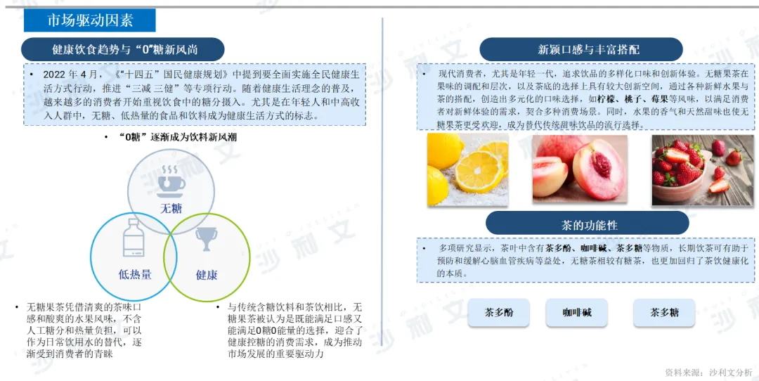 2022 年 4 月,《“十四五”国民健康规划》中提到要全面实施全民健康生活方式行动,推进“三减 三健”等专项行动。随着健康生活理念的普及,越来越多的消费者开始重视饮食中的糖分摄入。尤其是在年轻人和中高收入人群中,无糖、低热量的食品和饮料成为健康生活方式的标志。无糖果茶凭借清淡的茶味口感和清新的水果风味,不含人工糖分和热量负担,可以作为日常饮用水的替代,逐渐受到消费者的青睐。与传统含糖饮料和茶饮相比,无糖果茶被认为是既能满足口感又对身体健康有益的选择,迎合了健康控糖的消费需求,成为推动市场发展的重要驱动力。