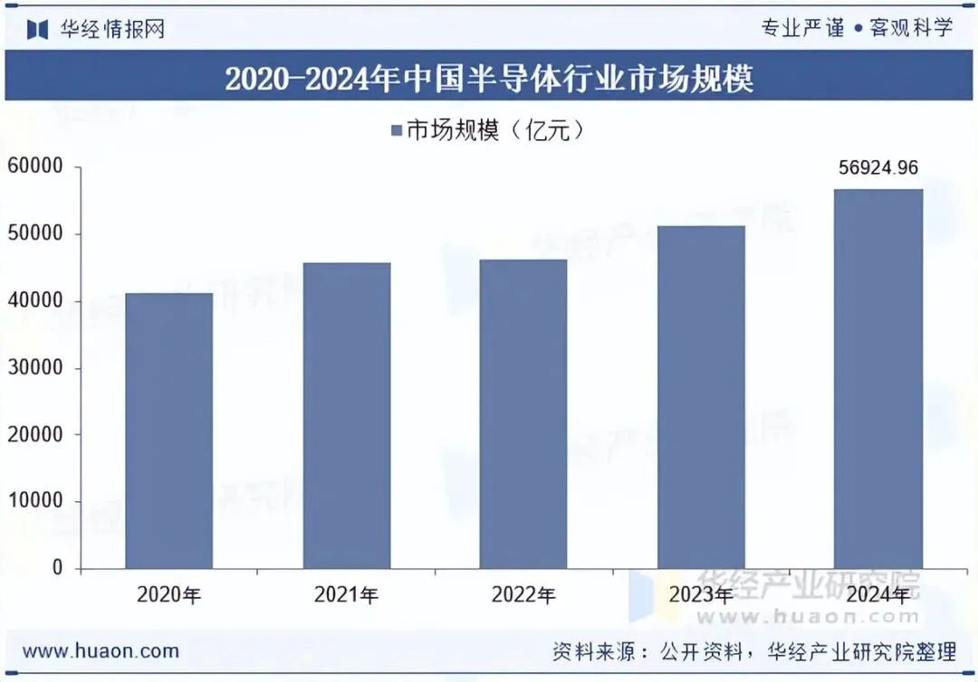 2024年中国半导体行业持续保持稳健发展态势,市场规模达到56924.96亿元,在全球半导体产业格局中占据重要地位。尽管行业仍面临高端技术突破、供应链安全等挑战,但随着国产替代进程加速,以及芯片设计、制造、封装测试等环节的技术迭代,市场规模稳步扩容。未来,在政策、需求与技术的多重赋能下,行业有望持续释放增长潜力,进一步巩固在全球市场的竞争力。