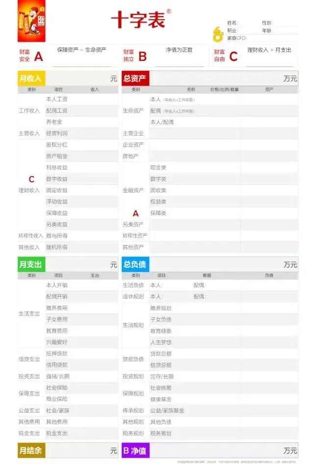 只需填写6项核心数据(月收入、月支出、月结余、总资产、总负债、净值),