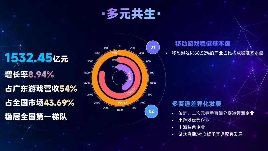 2025年广州游戏市场形成以移动游戏为核心、小游戏为最大增量、出海为核心战略、游戏直播为补充的多元赛道格局,整体结构更趋均衡,各核心赛道发展特征如下: