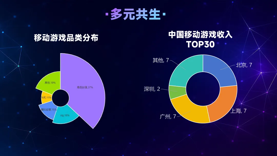 作为传统优势赛道,移动游戏占产业总营收68.52%(含小程序游戏16.90%),头部企业贡献占比超65%,规模持续稳固。产品覆盖MMORPG、SLG、二次元等品类,精品化、细分化为主流,同时探索“移动游戏+文旅”“移动游戏+文化传承”融合模式。