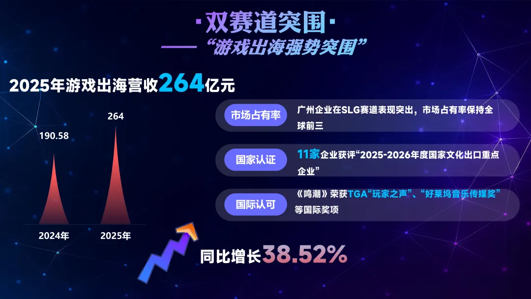 2025年出海营收264亿(2024年190.58亿),占全市总营收17.23%,同比增长38.52%,贡献广东省游戏出海营收超50%。广州企业出海成熟度高,策略类游戏(SLG)全球市场占有率稳居前三,出海呈现从产品输出到文化输出、从单一区域到全球布局、从粗放运营到精细化运营的特征;地方政策按结汇金额给予梯度奖励,降低企业国际化风险。