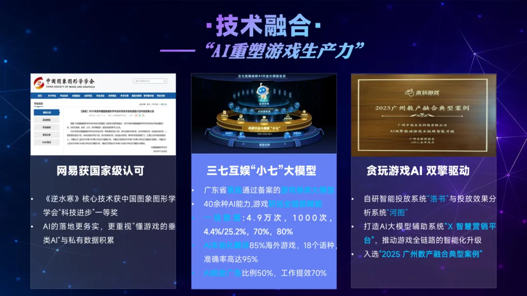 AI原生驱动全行业创新:人工智能从辅助工具变为核心生产力,头部企业聚焦核心技术研发,中小微企业依托AI降低研发成本、提升迭代效率。如三七互娱“小七”大模型实现剧情智能生成、多语种翻译,AI客服覆盖所有游戏,成为行业全链路应用样本。